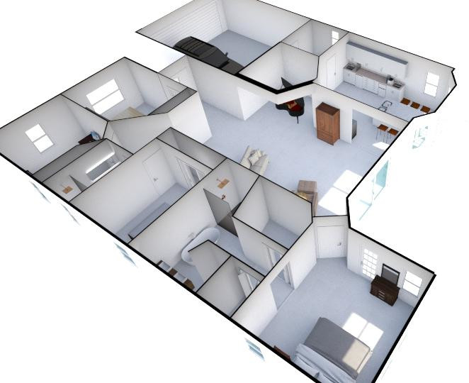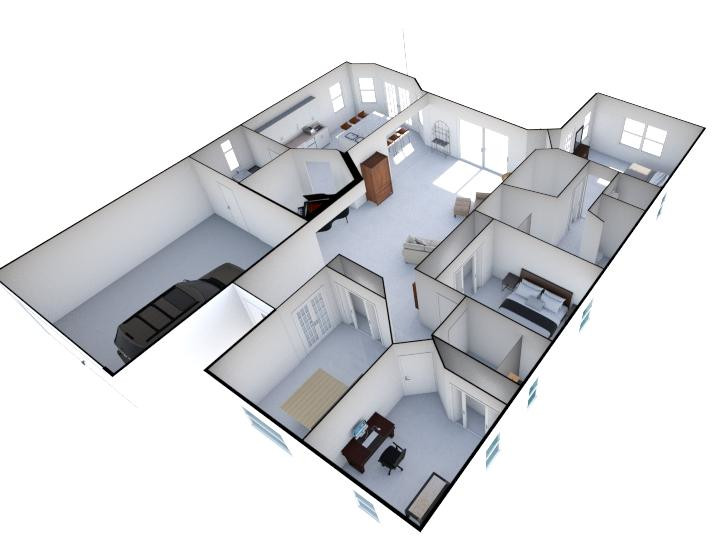 The furniture, cabinets, appliances, colors etc., are just what I could find to give the general impression. So pay little attention to the details. I’ve arranged the furniture and set up the rooms to reflect how I intend to use them (how the rooms in my current home are set up), so that will probably be close to the final result. The front two bedrooms will be used as a woodworking shop and an office, respectively. The bedroom by the guest bath will be a guest bedroom.