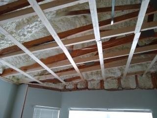 After a lot of thought, I decided to replace all the blown insulation above the ceiling with spray foam that would be applied directly to the underside of the roof deck. My motivation for this was twofold. Firstly, I wanted good insulation to help keep the A/C bills down. Secondly, and probably the deciding factor, was that it would provide greater access to the attic space and make working in the attic much more tolerable.