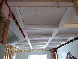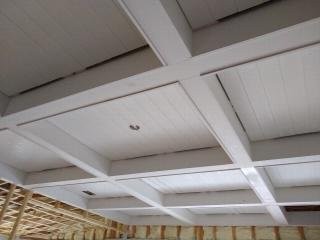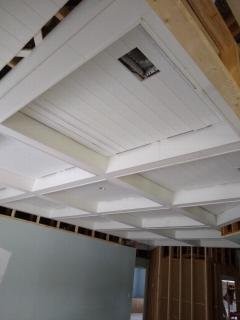 The tongue and groove (T&G) would need to be nailed to something that would be a consistent distance from the top of each coffer so that the distance from the T&G and the bottom of the coffer was consistent (we want a straight line all the way around). To achieve that I attached nailers to the top of the vertical boards as shown above, being careful to align them with the top of the board. I also added triangular nailers in all four corners. They are arranged diagonally so that the center is open for electrical stuff while still providing a surface for the T&G. These nailers were fastened to the vertical boards and I used a lot of shims when attaching to the joists. Below you can see how the T&G boards go up.
