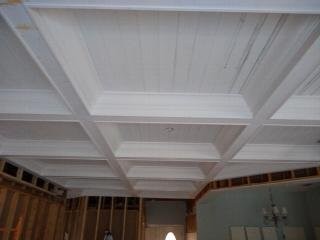 The next step in creating the coffered ceiling was to fill in the middle part. That will be done with pre-primed tongue and groove pine then finished with crown molding. When I framed the coffers, I tried to make sure they was square and level, requiring shims between the frames and the joists. So after the frames were wrapped, I had a pretty good reference surface to work from. That is, the top of the vertical boards served that purpose. The picture below will show you what I mean.