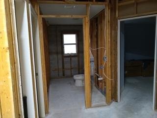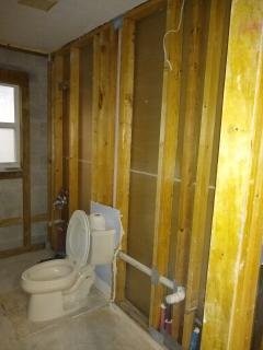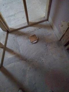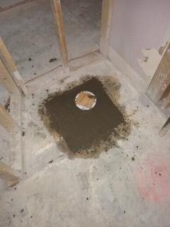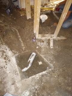 The pics below show the openings required to route the stack for the toilet. The first pic shows the hole required to hook into the existing line. The second and third pics show the new location of the toilet and how it connects to the existing line. The fourth pic is of Chris making sure the toilet flange is properly positioned relative to the walls that will enclose it.