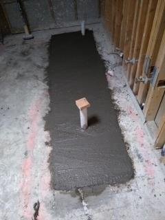 In the first picture above, you see the blue and red PEX supply lines coming up by the drain (we’ll be talking a lot more about PEX in the next post). Not clear in that picture is that I also ran an electrical line so the island will have power. Time for concrete.