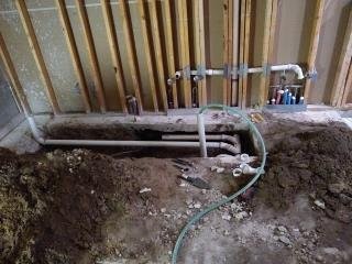 Since we wanted to limit the rental time for the saw, we moved on to the master bath next before doing anything with the area we’d just cut in the kitchen. Below are images of the cuts made for the drains for the bathtub and vanity. These shots were taken after the dirt had been removed and the pipes installed. The hose shown in the picture on the right is for testing. We ran water down the new pipes to verify they were leak free.