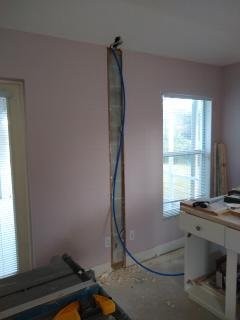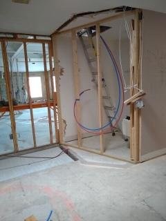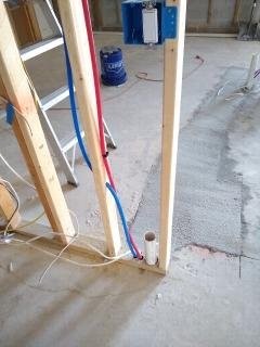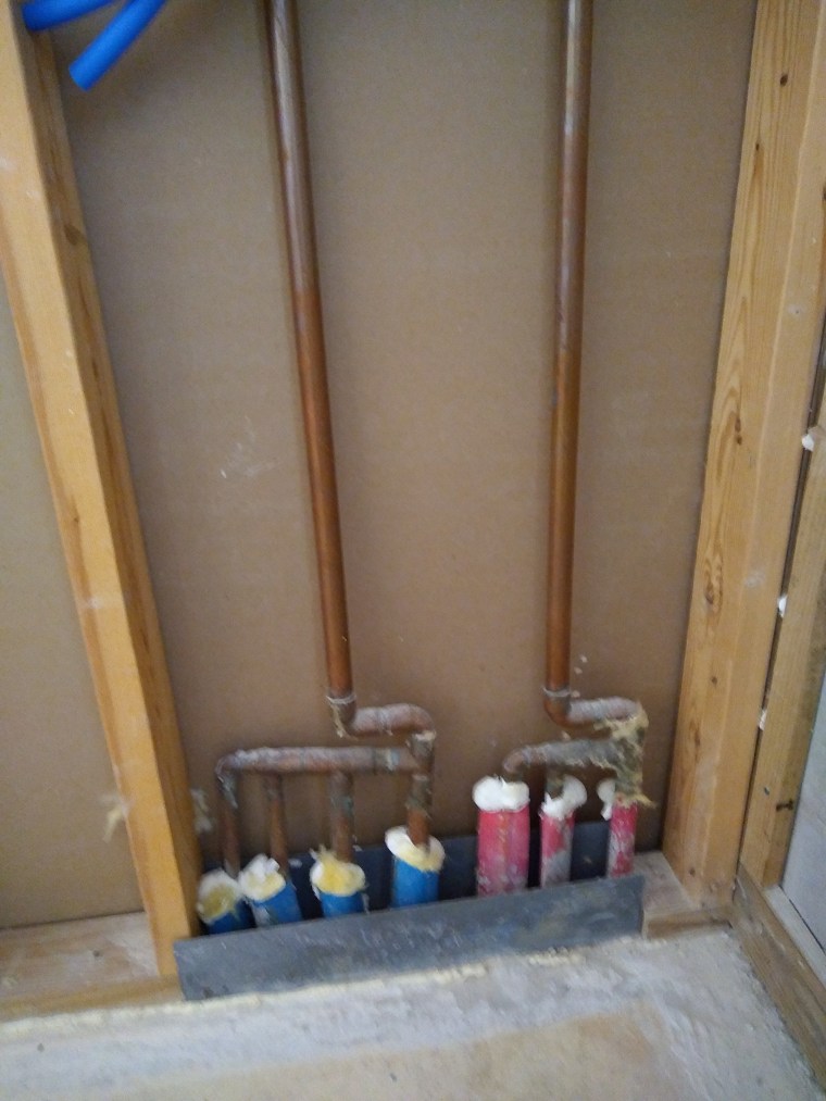 As you can see in the picture above, the lines will come down from a hole I punched in the ceiling in the laundry room. These two lines are the ones that will connect to the kitchen sink. They were encased in concrete on the other end, as I described in the post on trenching. It is important to note that these two lines will connect directly to the faucet for the kitchen sink. That is, there is no branching from these lines to other fixtures. This is the approach I chose to take for all fixtures. More commonly, a “trunk and branch” system is used, where lines are shared between fixtures. This is how the original copper lines were arranged. I decided to use a “home run” approach, where each fixture will have its own dedicated line that runs directly to the supply. This will be true for both hot and cold lines.