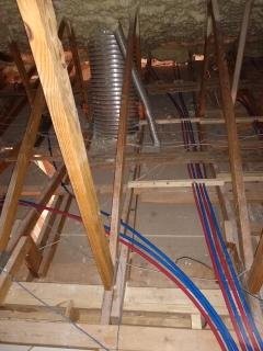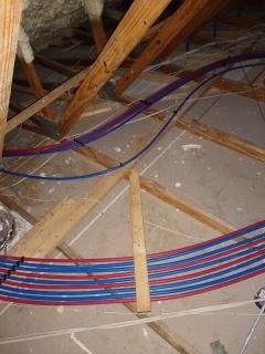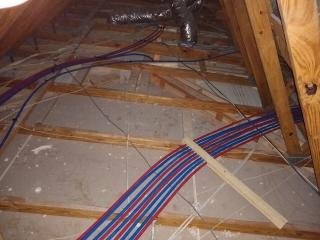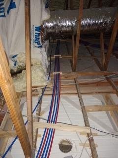 I’m not even going to try to explain which lines are which. The main point of these images is to show how nicely run they are (at least I think so). I’m not completely finished with this. I think I’ll add some more supports to reduce the distance between some of the runs so that I am in compliance with code. I won’t be completely done securing the PEX until all the fixtures are in place, but this gives you an idea of what happened to the lines once they disappeared above the ceiling in the laundry room.