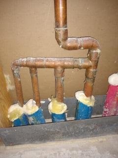 The first two pics are of the lines coming down from the ceiling for the kitchen sink. There will also be a hot water line for the dish washer (it doesn’t appear to have been run when I took this picture) and a cold line for the ice maker in the fridge. The third pic show five lines coming into the guest bath: hot and cold for the shower, cold for the toilet, and hot and cold for the vanity. The next three are of the lines feeding the master bathroom: hot and cold for the shower, hot and cold for the tub, hot and cold for both vanity sinks, and cold for the toilet. The final two images are cold lines that will connect to the spigots outside. The first is for the west spigot that comes down in the closet of the office closet. The second is for the south spigot that comes down into the master bedroom and will punch through to the lanai. There is a third spigot on the east side of the house beside the garage, but it comes off the copper supply line from the street before it reaches the laundry room, so I will leave it as it is.