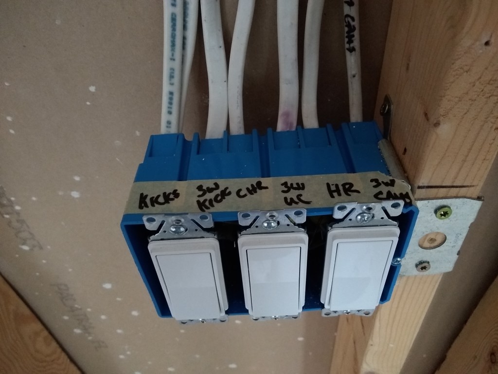 The can lights, under-counter lights, and kick lighting are also controlled by another set of switches so that you can control these lights when you enter from the garage. This required a 3-gang box on the wall next to the laundry room.