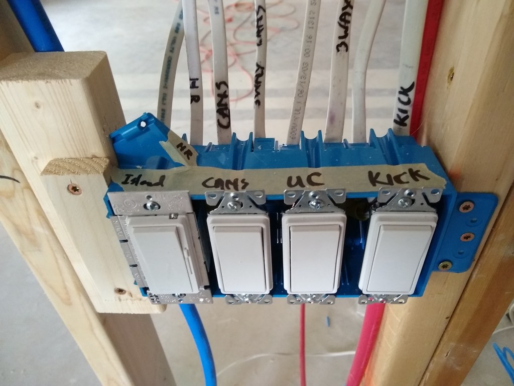 With that out of the way, I could get to work on the kitchen switches. I planned out what I wanted a long time ago, so I ran the wires before the kitchen ceiling went up. There will be two boxes to control the lights in the kitchen. One box will be a 4-gang that will be on the wall above the dishwasher. The first of the 4 will have a dimmer switch for the light above the island. Next to it will be a switch for the can lights in the ceiling. Next to it will be a switch for the under-counter lights, followed by a switch for the kick plate lights. I originally planned (and actually wired) dimmer switches for all 4 switches, but later changed my mind, thinking it was overkill. It was pretty unlikely that I would be dimming the lights other than the one above the island. Consequently, they were replaced with non-dimmable switches. I can always replace the switches with dimmers someday, if I fancy it.