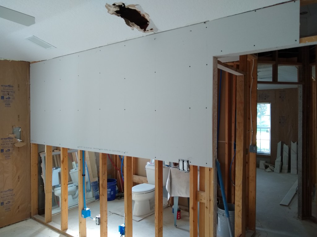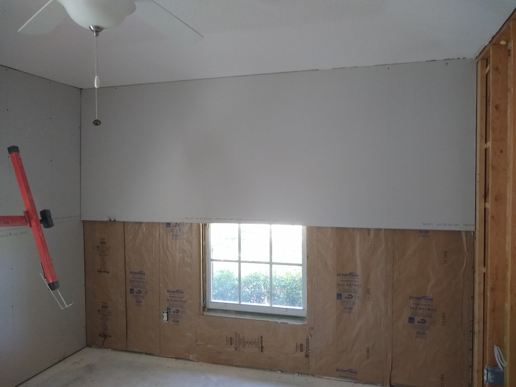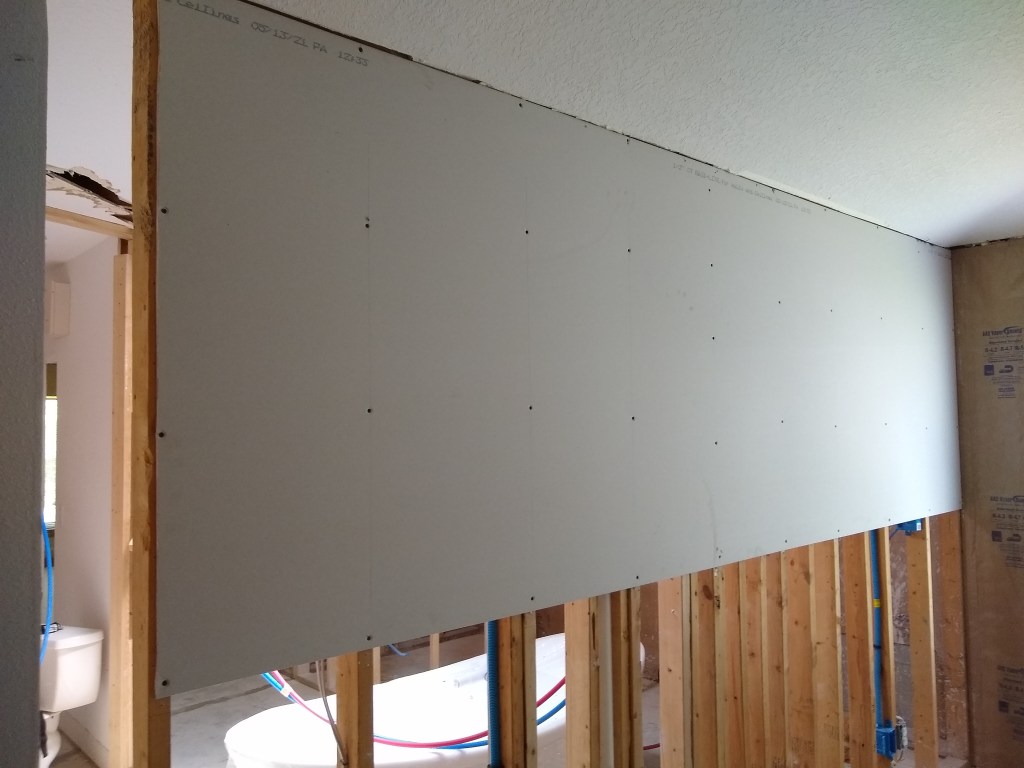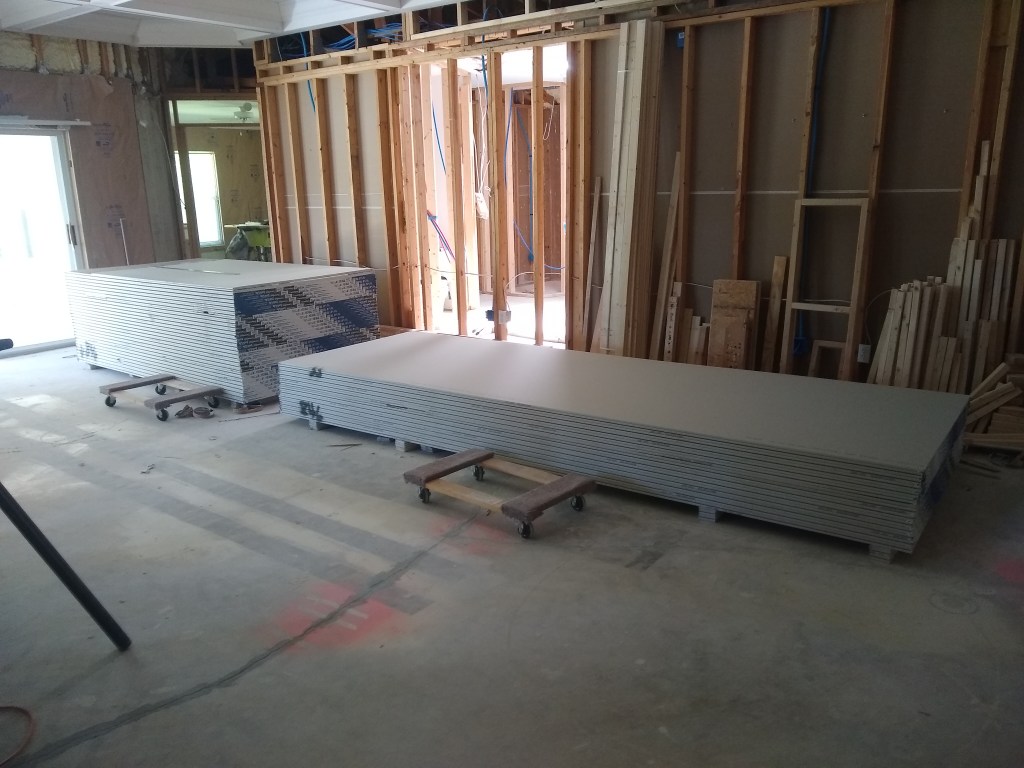 I took an unplanned hiatus through most of May, initially due to a cold. Once recovered from that, I was further delayed by my own hesitation about pulling the trigger on the drywall. I wanted to make sure that was the next step before I made the purchase. After convincing myself that it was, I took the measurements to establish how many sheets I would need, excluding the master bathroom (not sure what I’ll do there yet), My objective was to use as large a sheet as I could where possible to reduce the seems that would subsequently require taping. My measurements revealed that I would need 35 sheets of 12’x4′ and 60 sheets of 8’x4′.