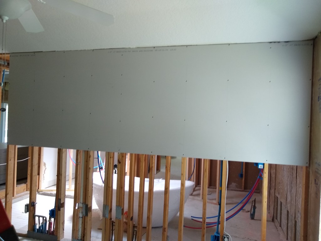 The first sheet I hung was a full 12’x4′ sheet, requiring no cuts. Here it is below.