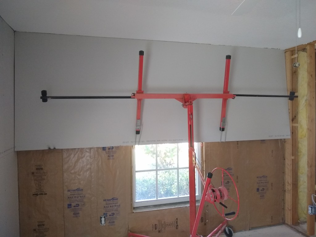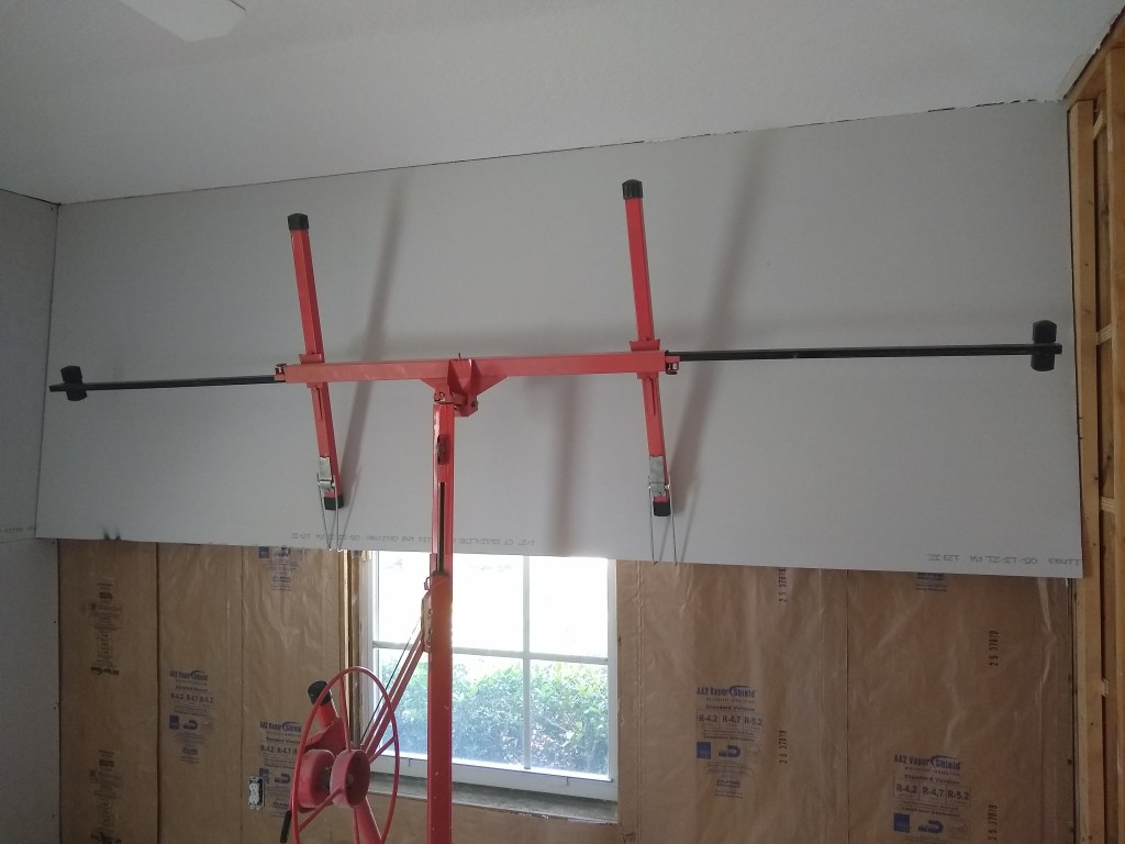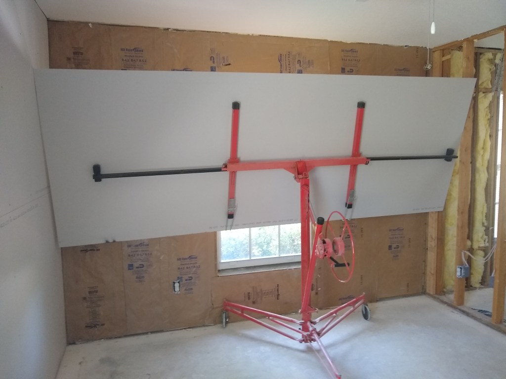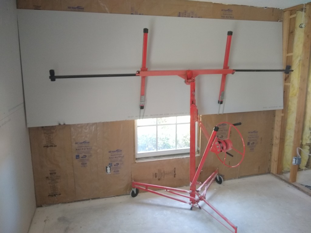 Now that I’ve shown how I move the sheets by myself, let me show the process of hanging a 12′ sheet. Using the dolly, I move the sheet into the room I am working on and get it close to the lift. I then have to physically pick up the sheet and place it onto the lift. That is not easy, but after trying several techniques I figured out how to do it without too much effort.