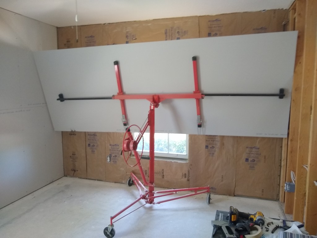 The next day I hung my first ever sheet of drywall! I had several reservations about doing this myself, especially with the 12′ sheets. My biggest concern was how I was going to mount a 12′ sheet on the upper section of the wall up to the ceiling. I did some research on YouTube and learned that I could do it using the lift I had. Until viewing that video, I’d only used the lift for raising things up to the ceiling and was unaware that it had features to assist with hanging drywall on high walls. That was my first and biggest problem solved. I would not have to rely on another person. A big relief.