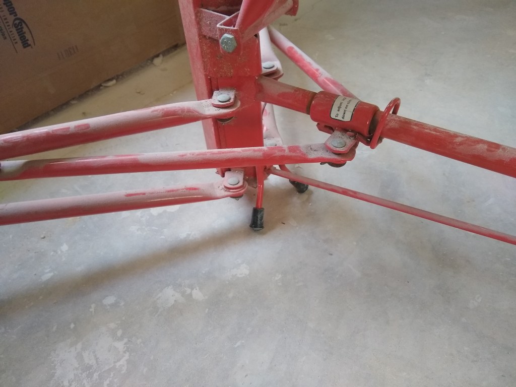 The pics above are of the sheet on the lift positioned to go on the north wall of what will be the office. I had already finished hanging the guest bedroom and the west wall in the office before I started writing this post. It was only when I started describing the process that I realized that pictures were required. So what you’re seeing is not my first attempt. The pics show the lift moved close to the wall. This is the first step. Next I must tip the top of the sheet so that it rests against the wall. In the image below, you can see that the bottom edge of the sheet is still supported by the lift, but the top edge is not. It is now leaning against the wall. For this to work without the lift rolling away, it has a set of brakes with rubber ends to prevent the lift from moving.