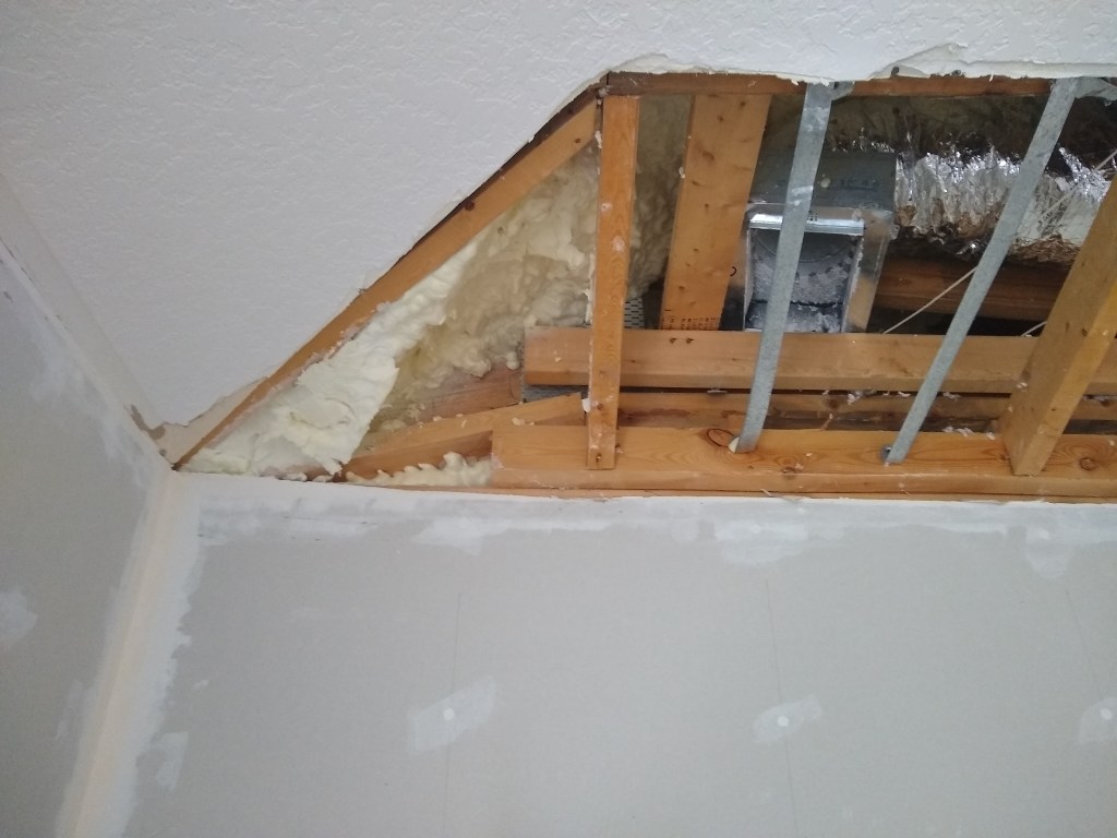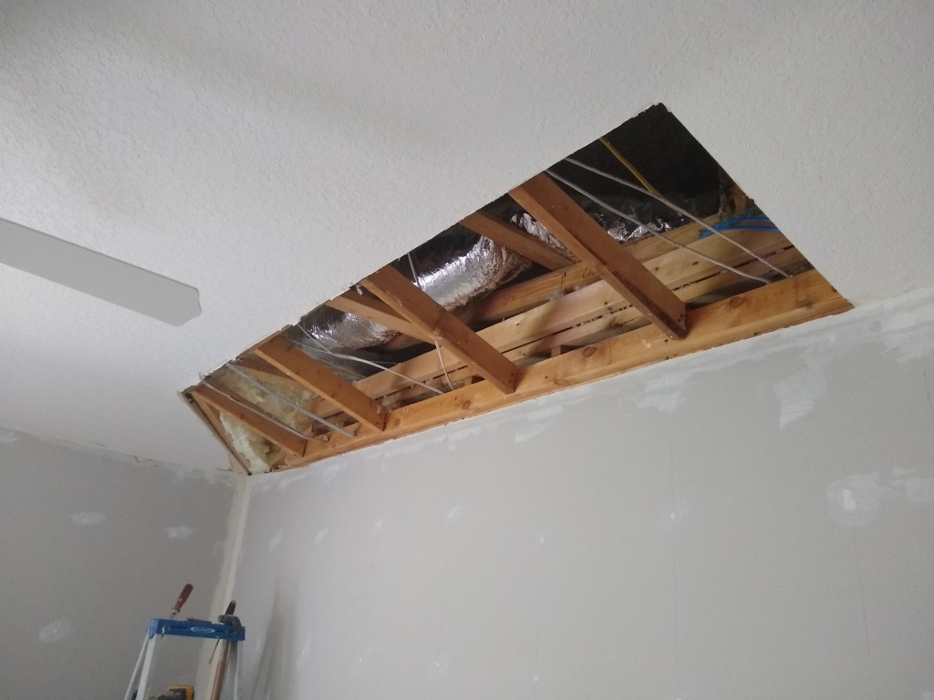 I decided to address the opening in the ceiling of the guest bedroom first. We opened that area long ago to see why the ceiling and the wall in the corner were not straight. It didn’t really reveal anything obvious, so I decided to open it up further.