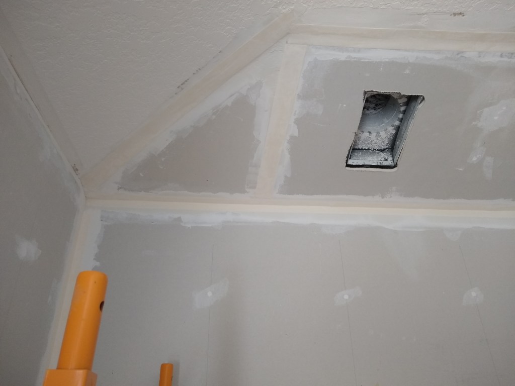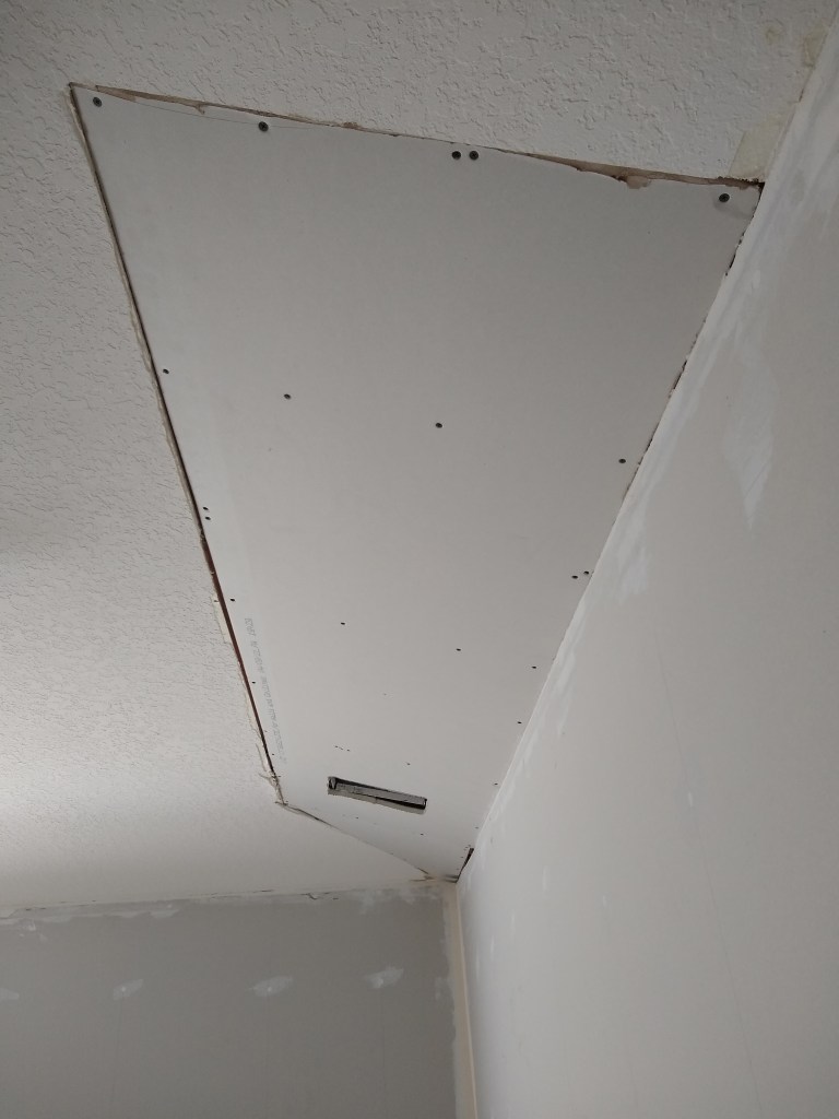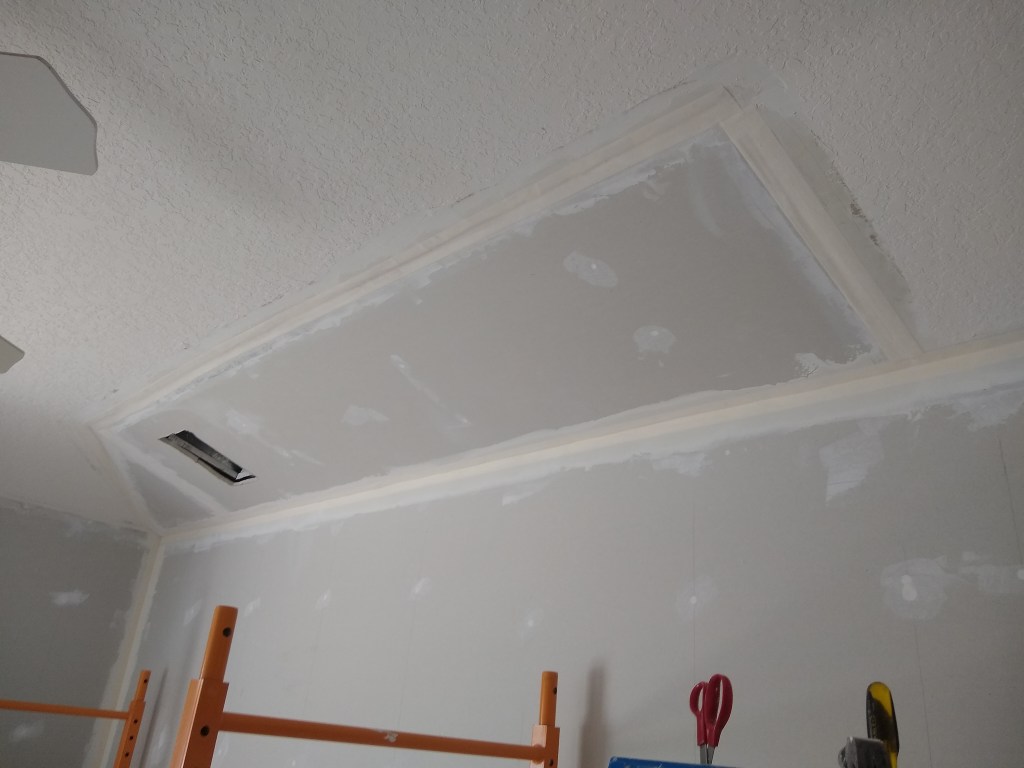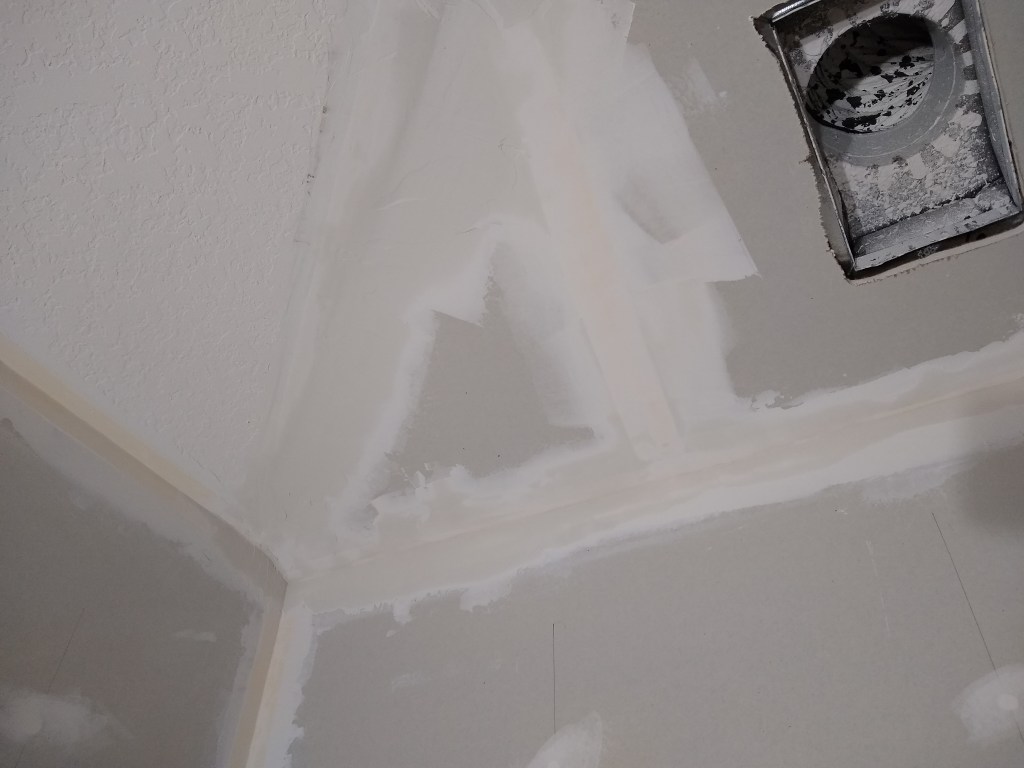 One of the most difficult parts of this was the work required to tape the corners between the new drywall and the ceiling. This required that I scrape and remove the tape that was under the finished surface of the ceiling to make room for the new tape. I used a wet sponge to soften the dry knockdown texture covering the tape on the ceiling, then started picking away at it. Sometimes I would get a nice long strip to come off, but mostly it involved pulling bits and pieces. In the end I was successful and was able to apply new tape to the corners. It turned out well, but I’m not looking forward to doing this in the other rooms. I’ll search for a more efficient method when I get to that again.