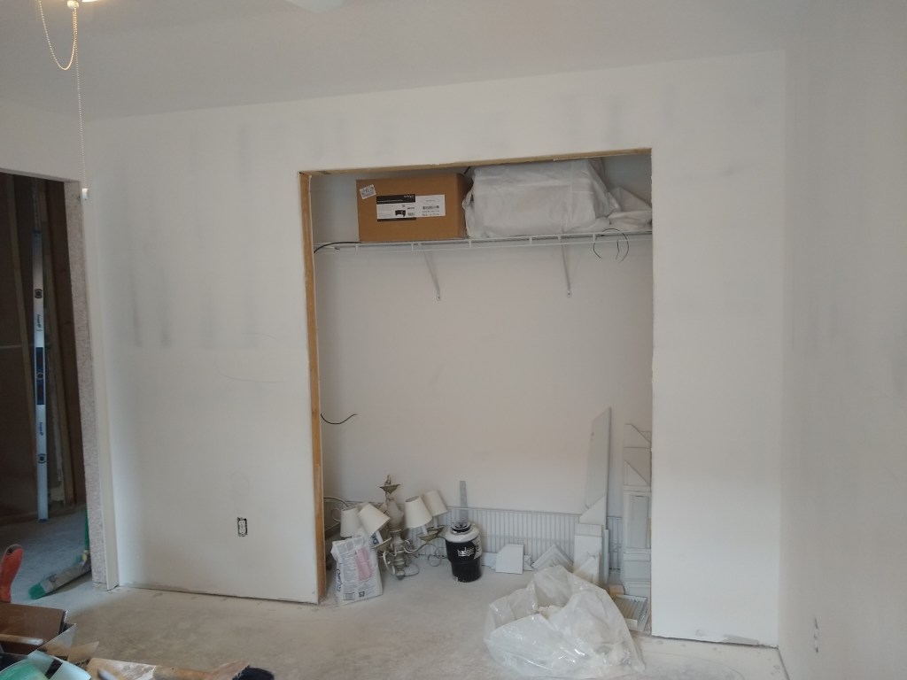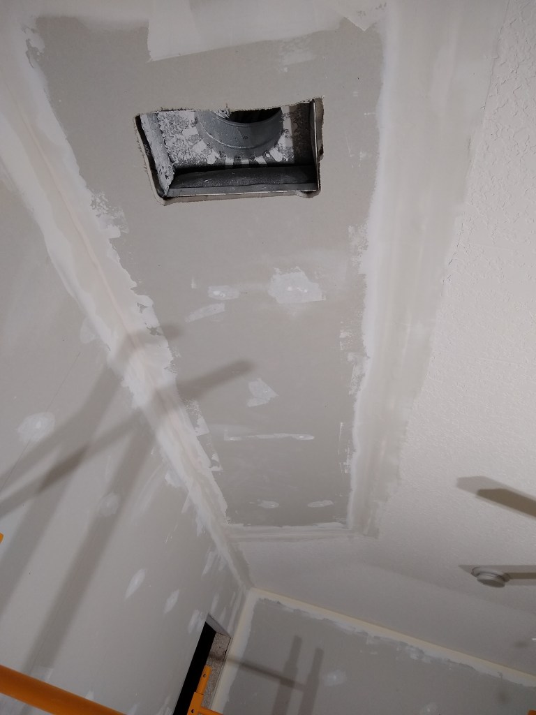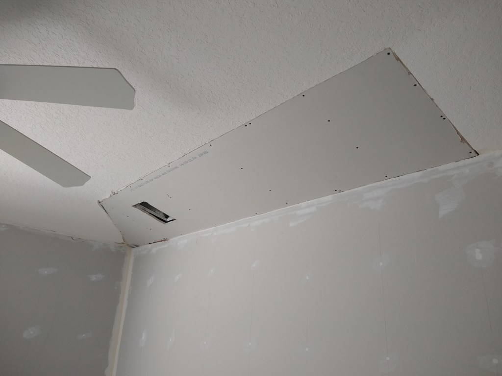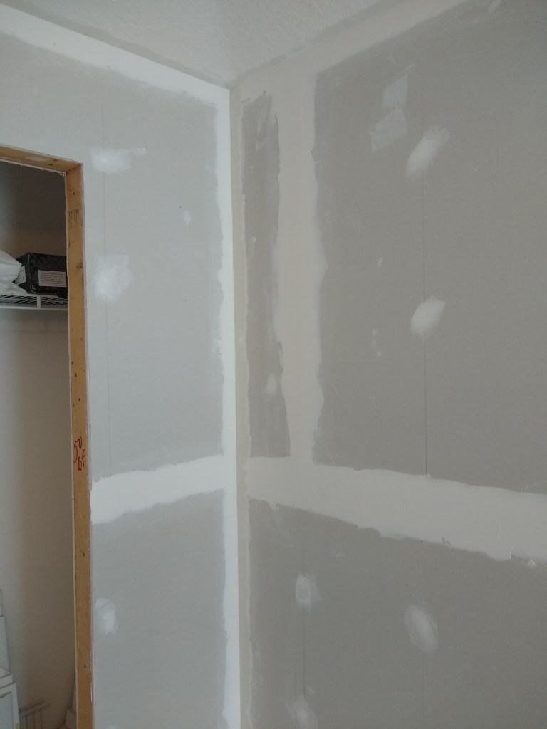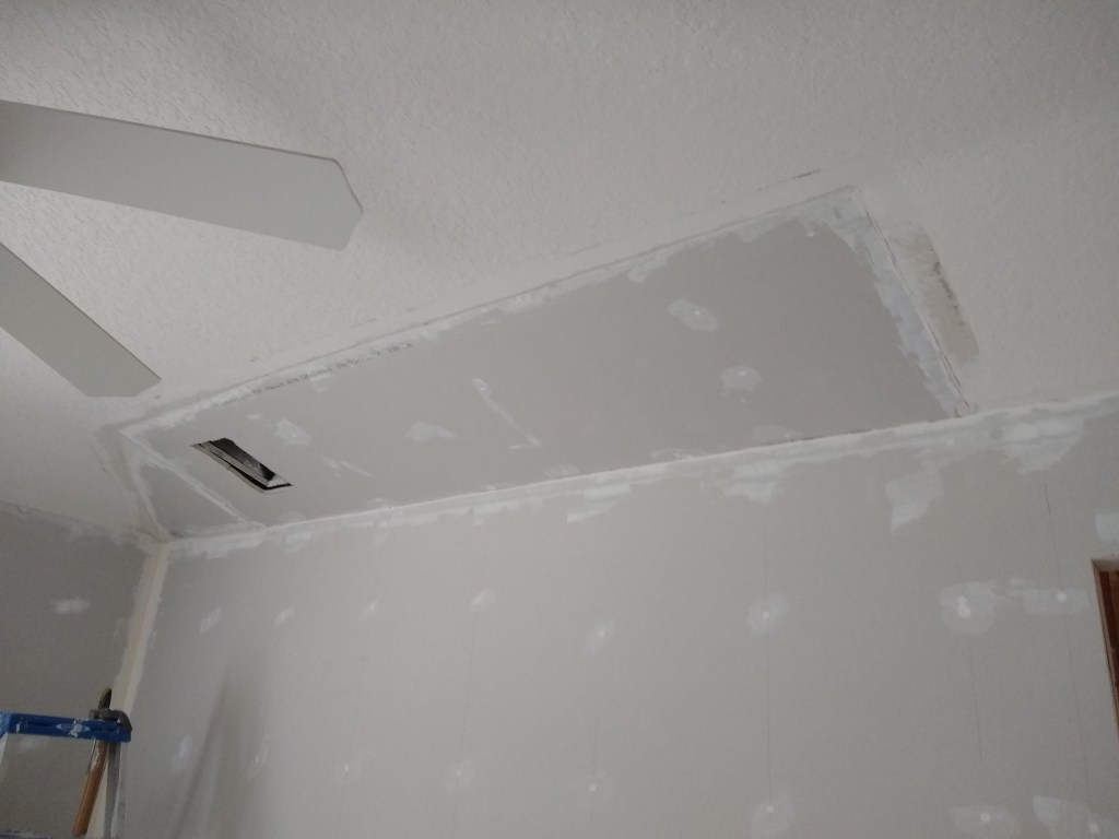 One of the most difficult parts of this was the work required to tape the corners between the new drywall and the ceiling. This required that I scrape and remove the tape that was under the finished surface of the ceiling to make room for the new tape. I used a wet sponge to soften the dry knockdown texture covering the tape on the ceiling, then started picking away at it. Sometimes I would get a nice long strip to come off, but mostly it involved pulling bits and pieces. In the end I was successful and was able to apply new tape to the corners. It turned out well, but I’m not looking forward to doing this in the other rooms. I’ll search for a more efficient method when I get to that again.