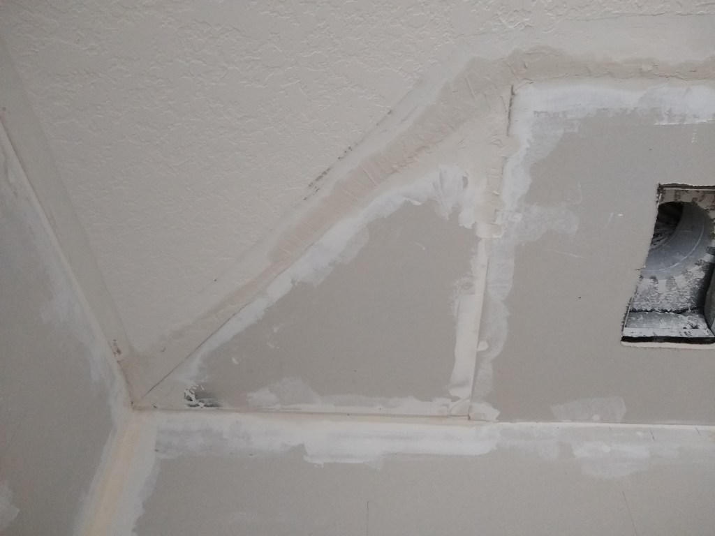 By straightening the ceiling (it no longer swoops up to meet the adjacent part), the corner piece is a bit lower that the adjacent part of the ceiling it meets. I could not improve upon that without major surgery, so I will make the adjustments using mud (what they call “mud framing”). The patch looks kind of ugly right now, but it will be fine when I tape, mud, and finish it. You can already get a sense of it after prefilling the gaps.