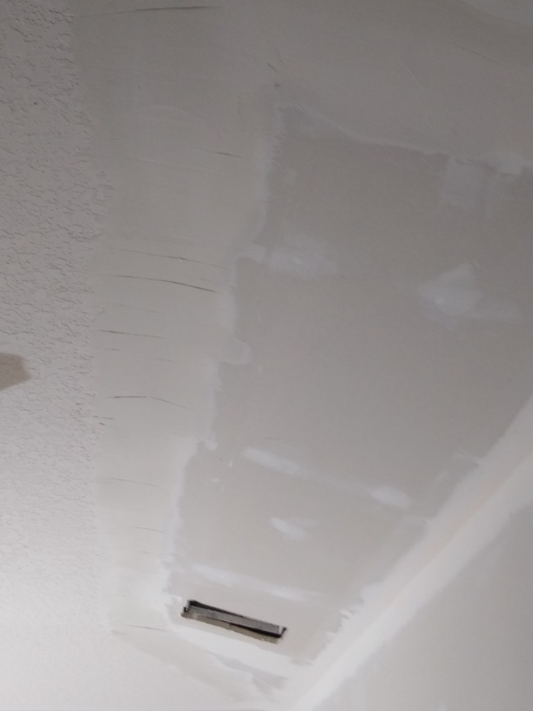 One of the advantages of addressing the ceiling patch first, was that it gave me an opportunity to try taping and mudding in an area that will likely be covered by a texture (knockdown or skip trowel) and therefore more forgiving. After doing this I felt ready to start taping and mudding the rest of the seams in the guest bedroom, which will be less forgiving. Here are several shots of the result after applying my first cover coat. Note that while doing this I continued to add additional coats to the ceiling patch as I went along to smooth it out (more required, though).
