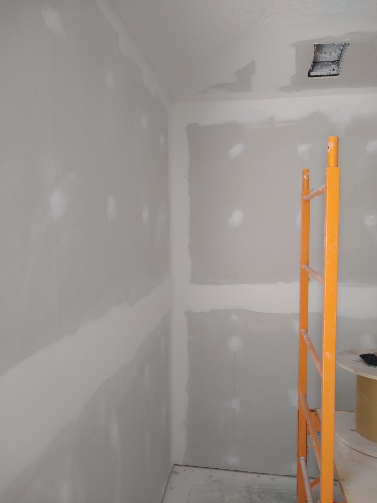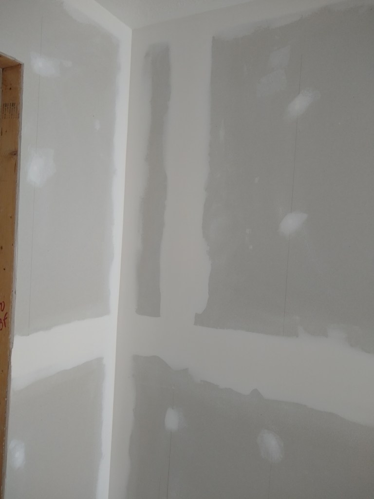 To bring the walls to level 4, I required a second coat of mud. I did this in stages, applying the mud to one side of the inside corners first, then the other side the next day. I did some light sanding in between to get rid of any obvious imperfections and tool marks.