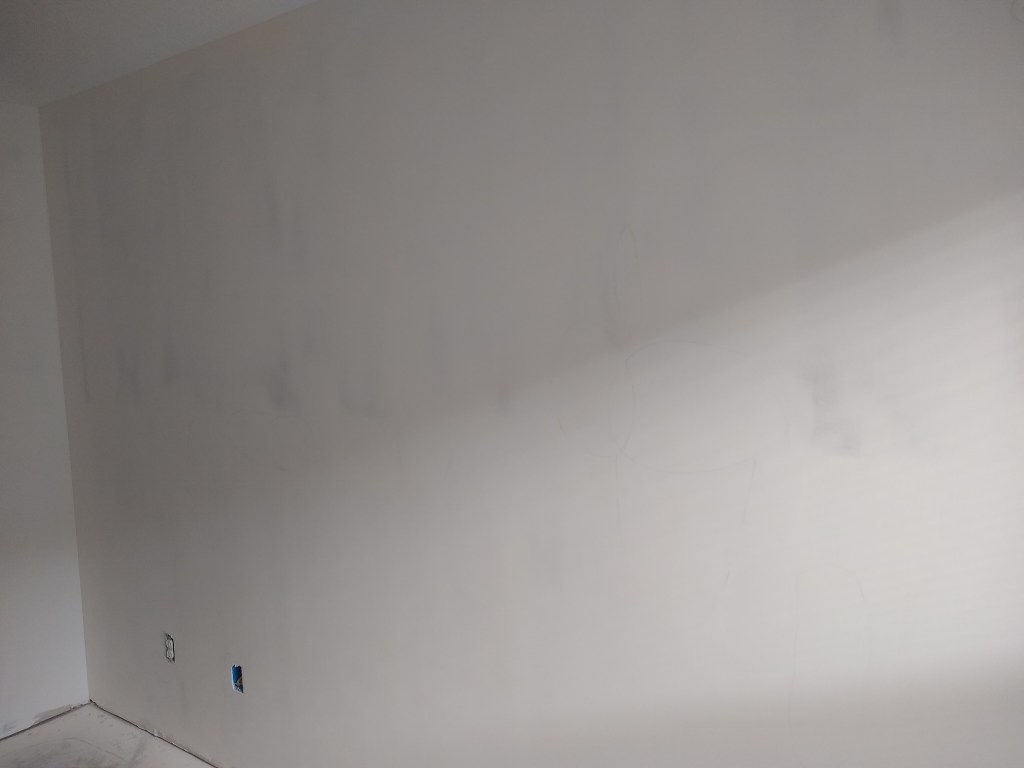 I did this for all walls over several days, then started on a second skim coat for all walls. Between coats I did a bit of sanding, but after the second skim coat, I paid more attention to the sanding and finish. The second skim coat would be the final one before paint primer, so I spent a lot of time looking for imperfections and sanded them as needed. I also identified areas that needed a bit more mud and touched them up before the final sanding. Here is the result.