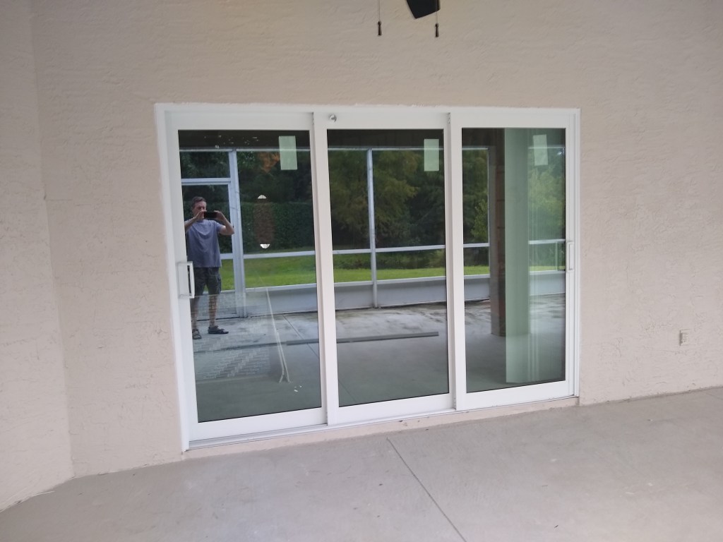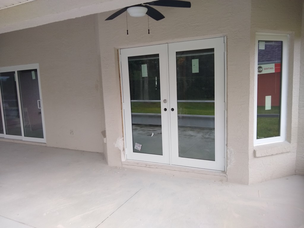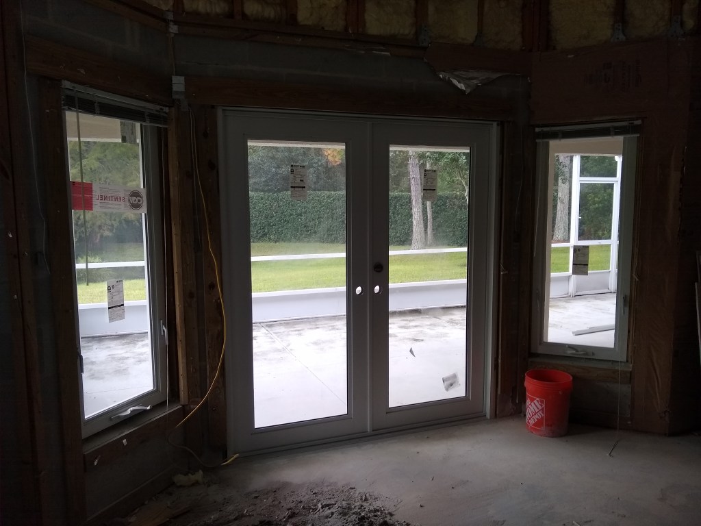 I took these pictures before the work was finished, which is why you see no handle on the french doors and stickers on the windows, but you get the idea. Since these are impact/hurricane windows, they are quite substantial. As a result, there is a noticeable reduction in outside noise, which is very nice.