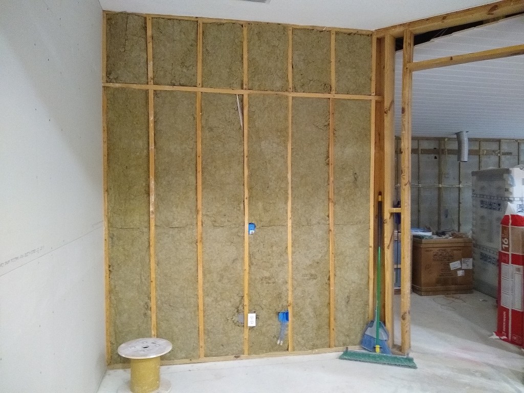 This wall is about 10 feet high, so it required two and a half sheets of drywall (notice my new lift!). That wall borders the garage, which is insulated with the usual batt insulation. The next wall I tackled was the adjacent wall (east), however, before doing that I had to make a decision about sound insulation for interior walls. As mentioned in a previous post, I was not really impressed with the sound dampening effects of the MLV I used between the workshop and office, so I decided to try a product called Safe and Sound, which is a stone wool batt insulation that has sound deadening properties.