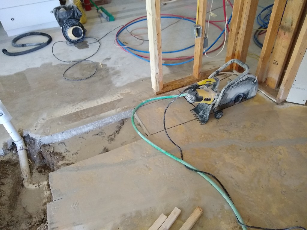 The next part would be tricky because I had to remove the concrete from under the bottom plate of the wall so I could feed the water and electrical lines down. I used my big honkin’ saw to get as close as I could, but resorted to a drill bit and cold chisel and hammer to get the rest of it.