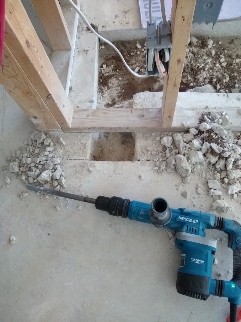 You can see how I used the saw to get as close to the bottom plate on the one side (cutting into the plate a bit) and how I used the saw again to give me a starting point on the other before resorting to the drill. I chipped away at this for some time using a hammer and cold chisel before giving up. So I went home to look into renting a small powered jack hammer. While exploring that option, I decided to buy one instead since I expect I’ll need it for the two showers too. So I picked one up from Harbor Freight and it made quick work of it.