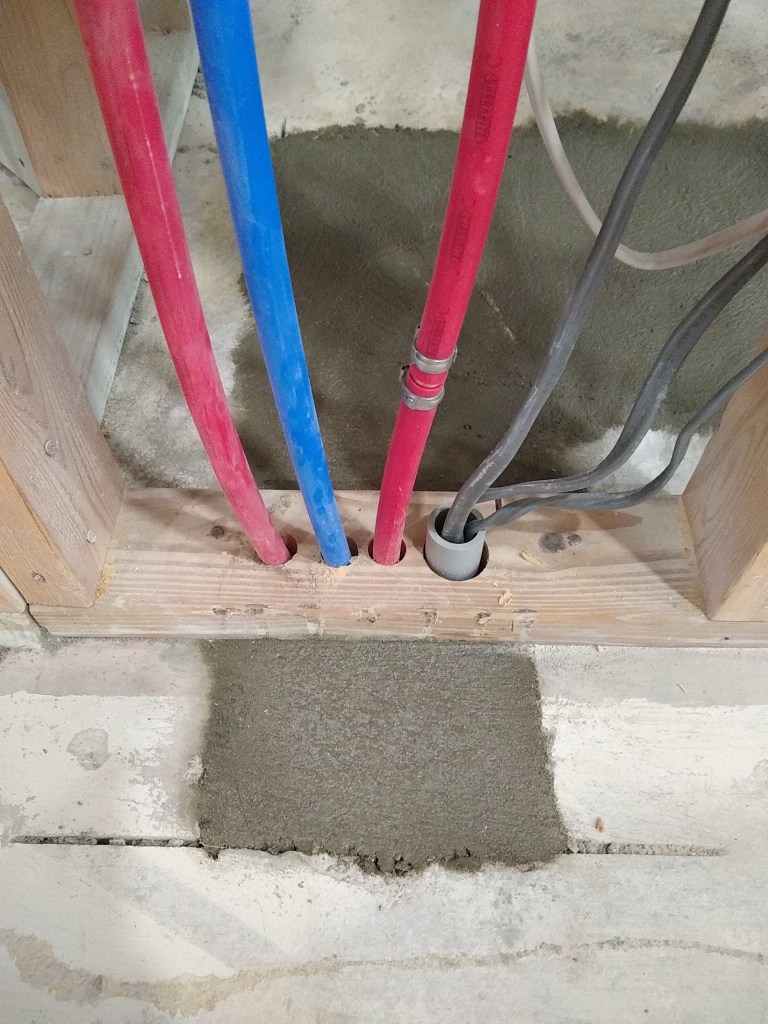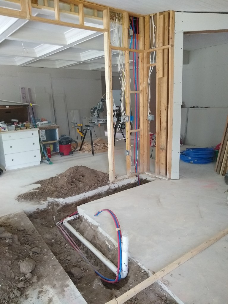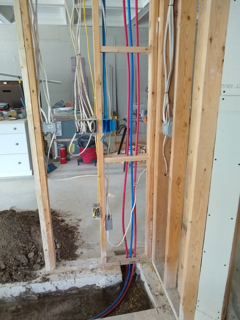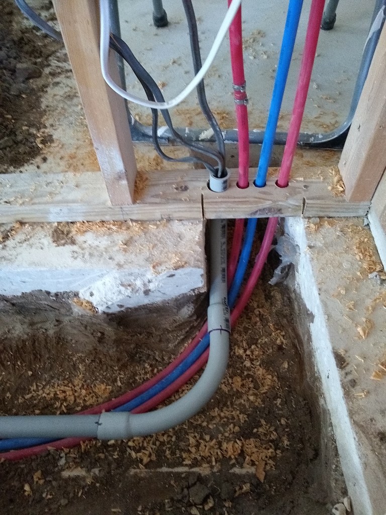 Here they are coming down from the ceiling entering the trench. Note the bracing I added to support the lines within the wall.