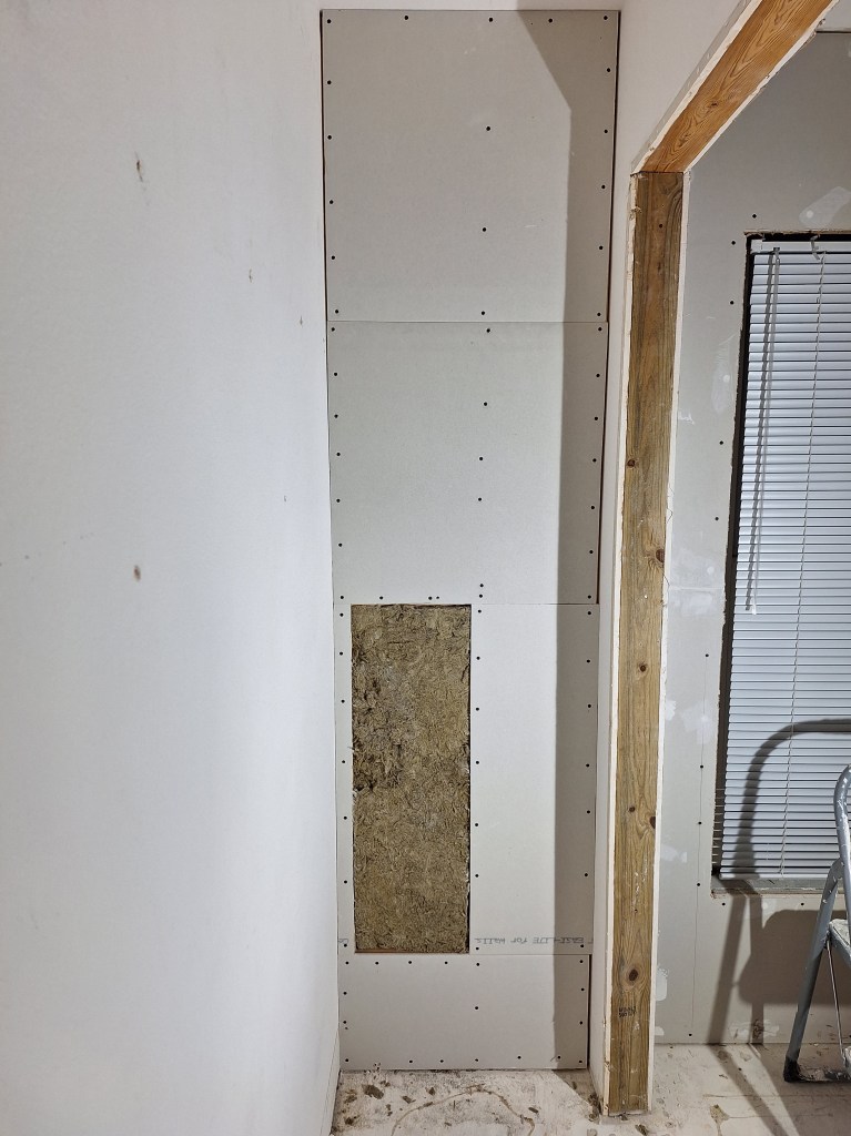 Also notice the screws in the wall in the image above. Some are prefilled (covered in white mud) and others are not. The screws not prefilled are the additional screws I referred to earlier.