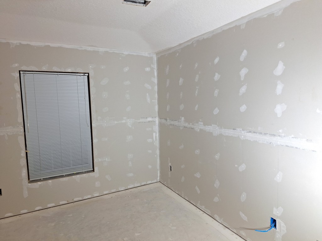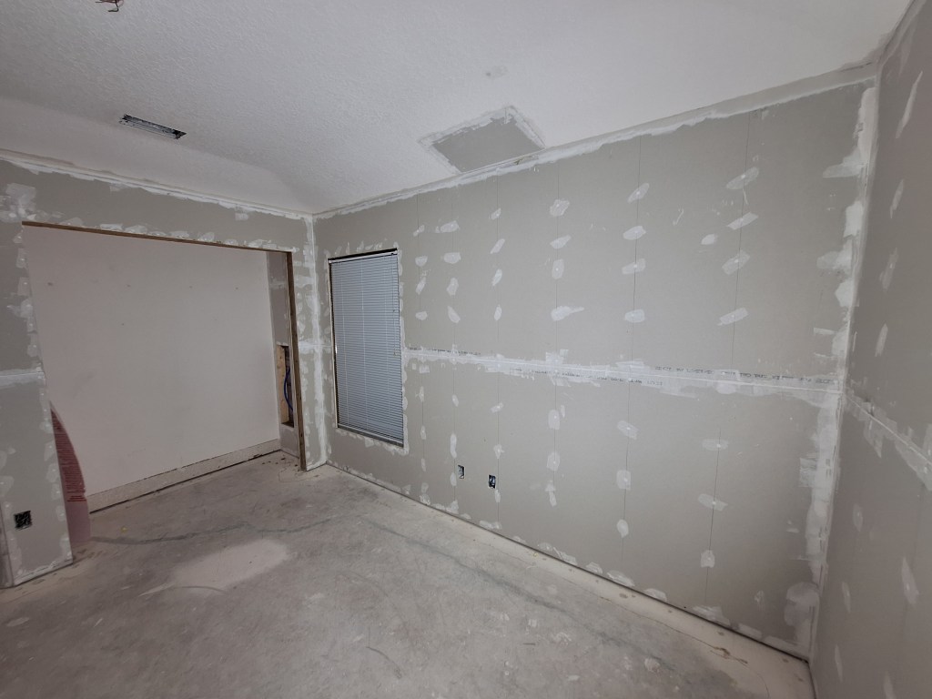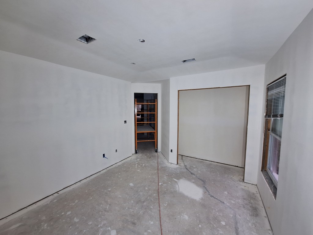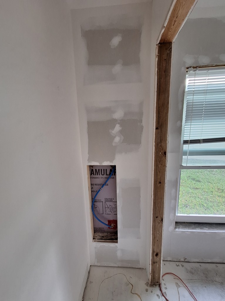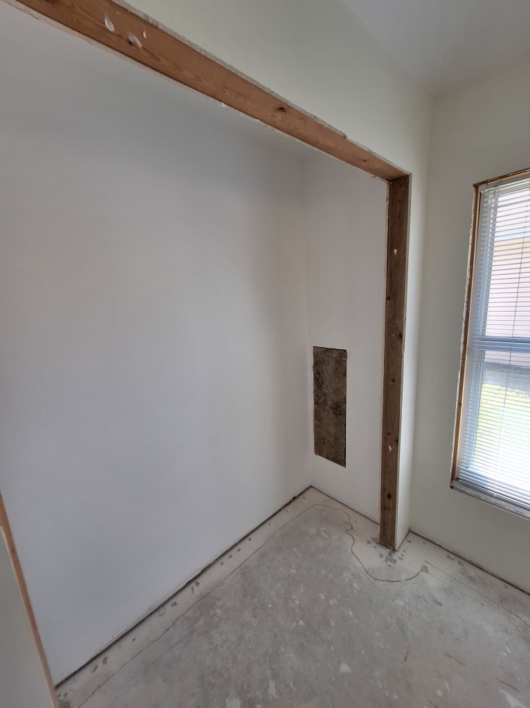 I also skimmed the back wall of the closet. The closet walls are textured (orange peel) and I wasn’t originally going to do anything to them, but I decided to skim the back wall since it is seen and adjacent to the exterior wall which I am also skimming. The other walls in the closet were left alone. I saw no benefit it skimming them to cover up the texture since they will never be seen. They will, however, be painted.