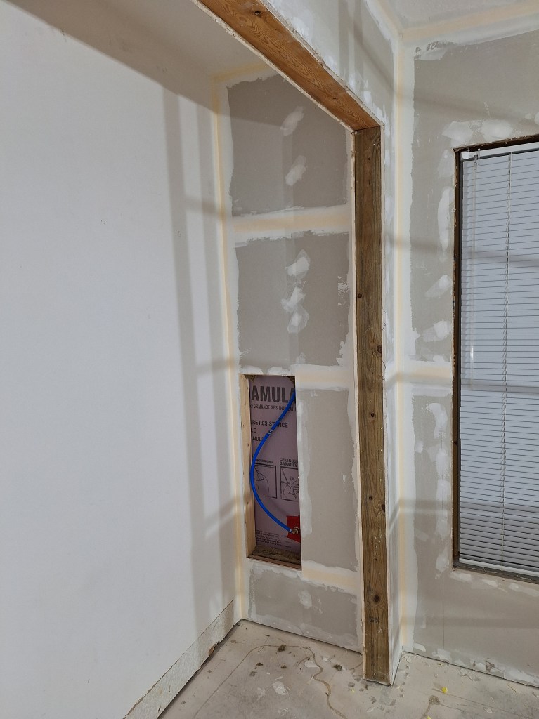 I used off-cuts for this area. I have so many off-cuts that I was happy to be able to use some of them. Using off-cuts will mean I have more taping to do, but I’m happy to do it to avoid waste. Also of note, the insulation you see in the opening is one piece, so should I need to get access to the water line, I can simply pull out that piece of insulation without it impacting the other parts.
