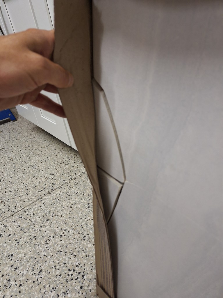 The shower wall tiles had been sitting untouched during most of the time I was painting the main areas of the house. However, I took the step of unboxing them as soon as they arrived to make sure they were intact before setting them aside. There were three broken tiles, and I communicated that to the distributor. However, I ordered a sufficient amount that I didn’t think replacements would be needed. Here is one of the pictures I sent to the distributor showing the broken tile, still in the box.