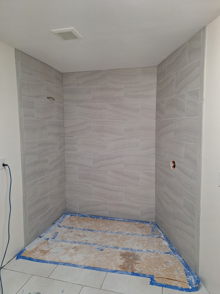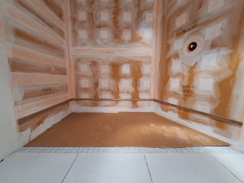 The first step in bringing this to life was to protect the shower floor tiles with a cardboard covering and to install ledger boards above the bottom row of tile to set a reference.