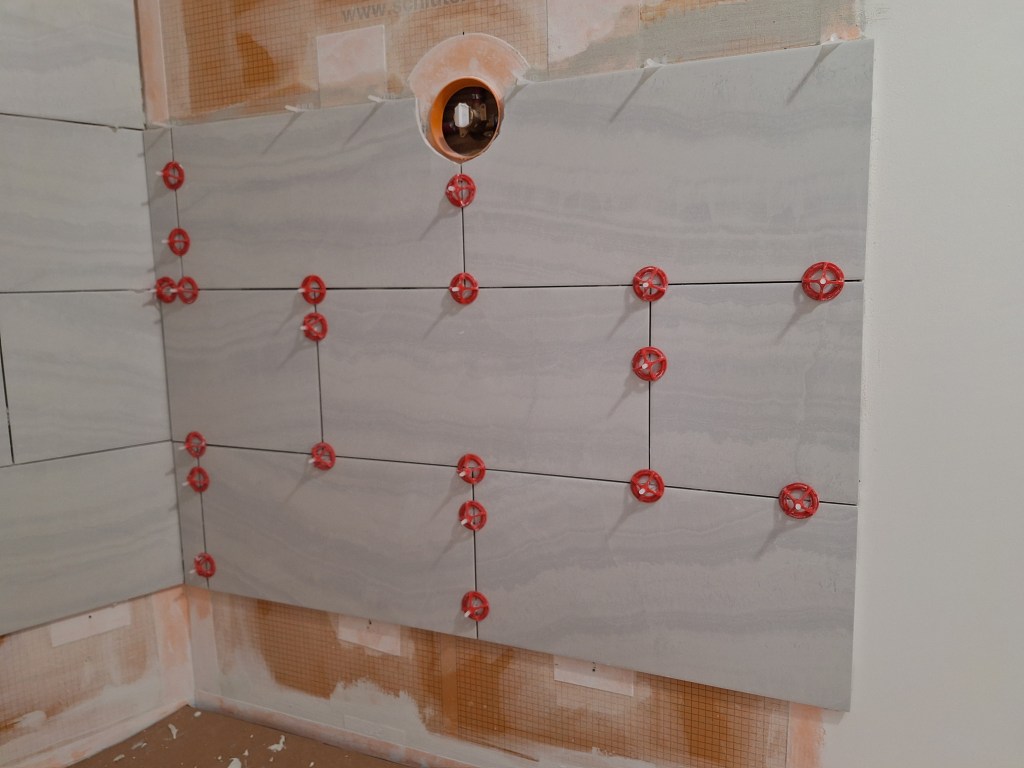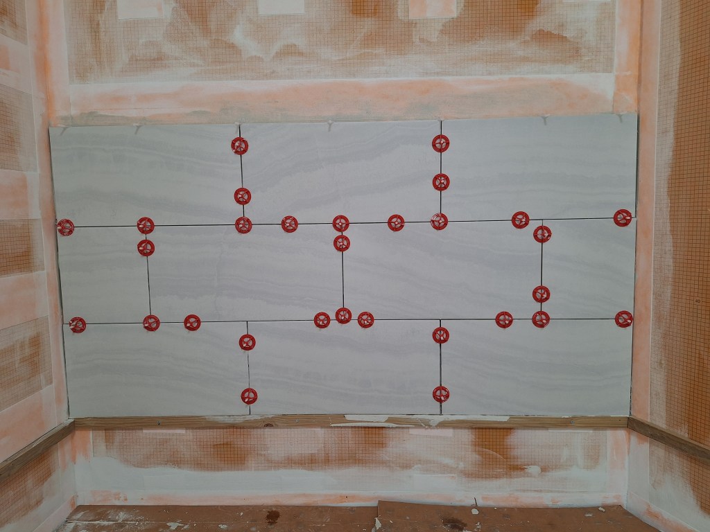 All those red things are tile levelers. They screw onto plastic clips that are placed behind the tiles to pull them to the same level. After the thin-set dries, you knock them off will a rubber mallet and the plastic clips are supposed to break along a perforation. Unfortunately, it often doesn’t break cleanly, so there is usually some tedious cleanup work to remove the bits that remain.