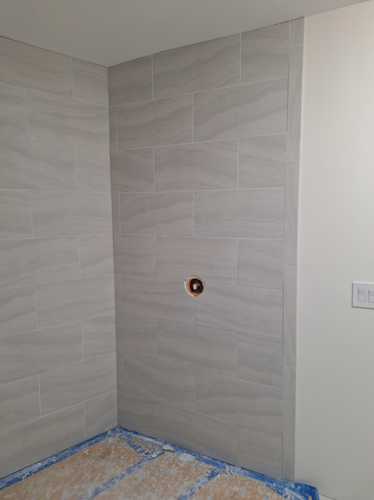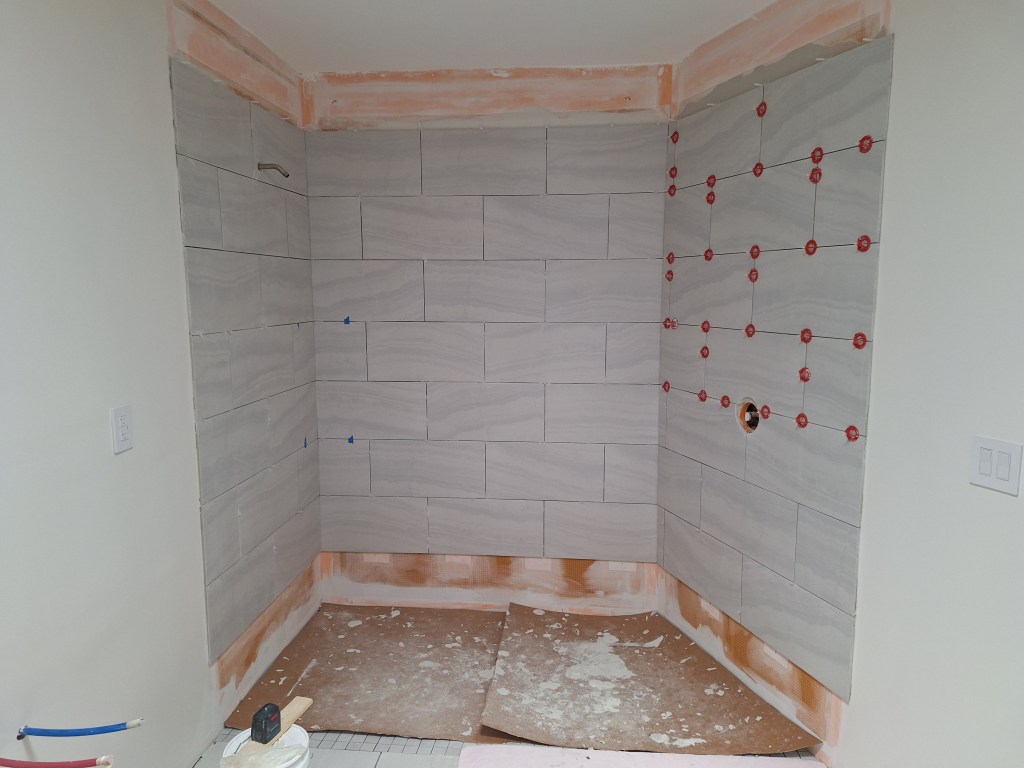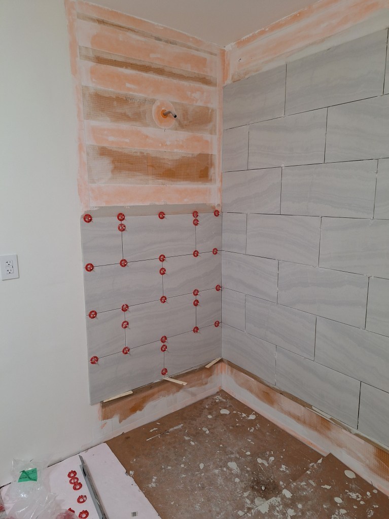 I finished the back wall up to, but not including, the top row, then started on the shower head wall. I will do any scribing (top and bottom) when all the other tiles are in place.