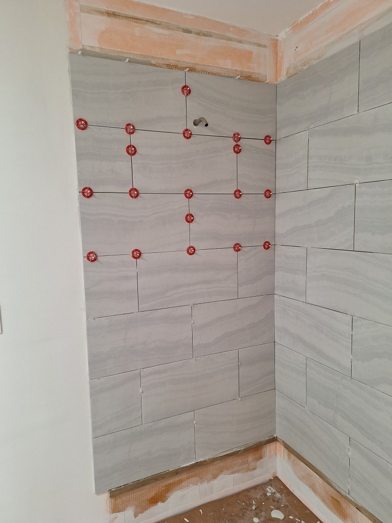 The next step was to place the tiles the meet the floor and ceiling, followed by the bull nose tiles to finish the edges where they meet the finished wall.