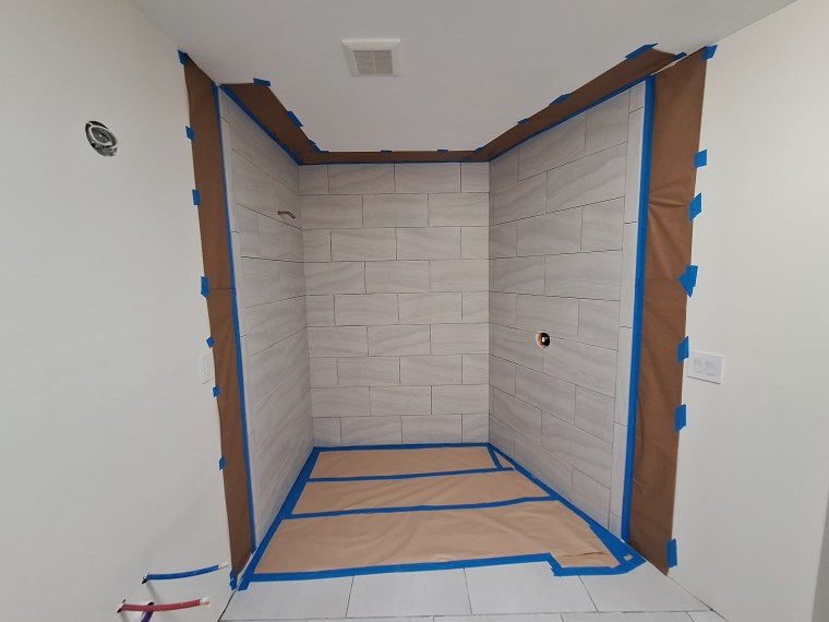 I think it looks pretty good, even before the grout. To prepare for grouting the shower walls, I masked off all adjacent surfaces.