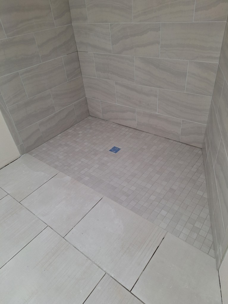 Having never grouted before, I decided to just do the shower head wall and then leave it for the day. If, for some reason, it looked really bad the next day, I’d have just one wall to correct rather than all of them. Here it is just before I left for the day.