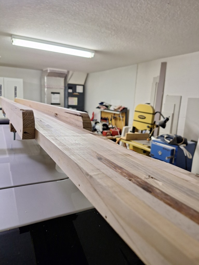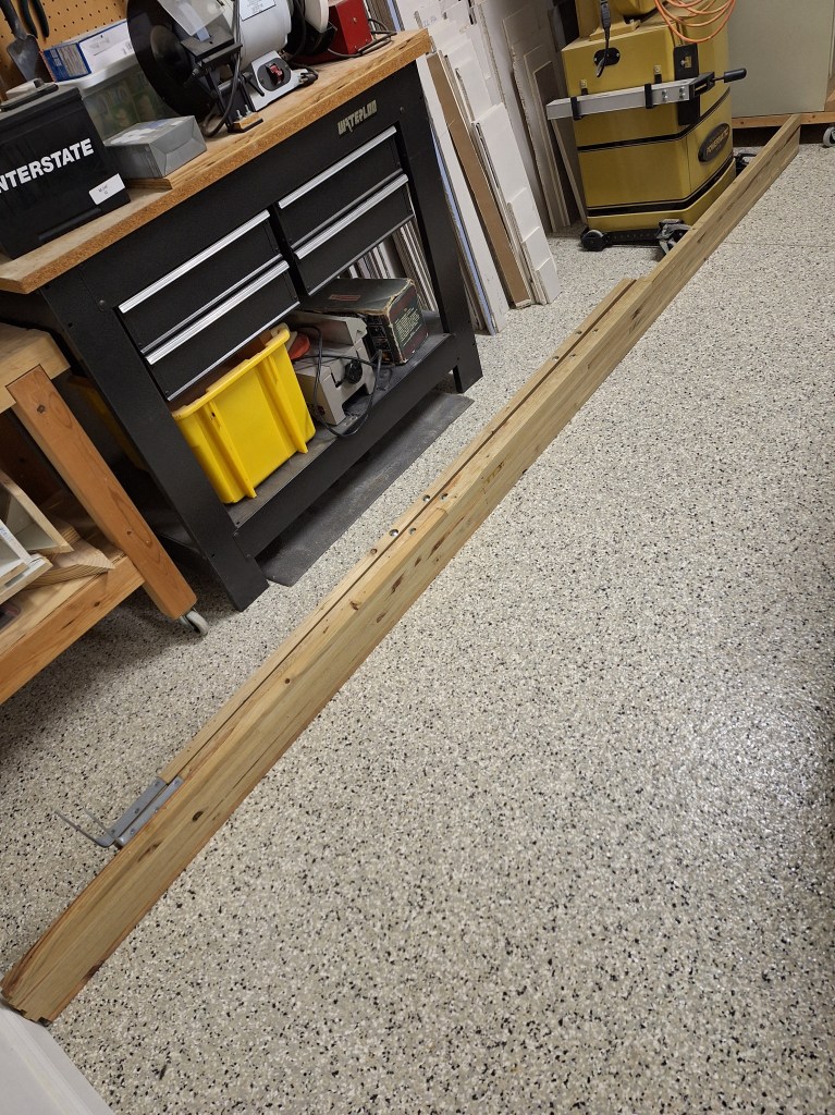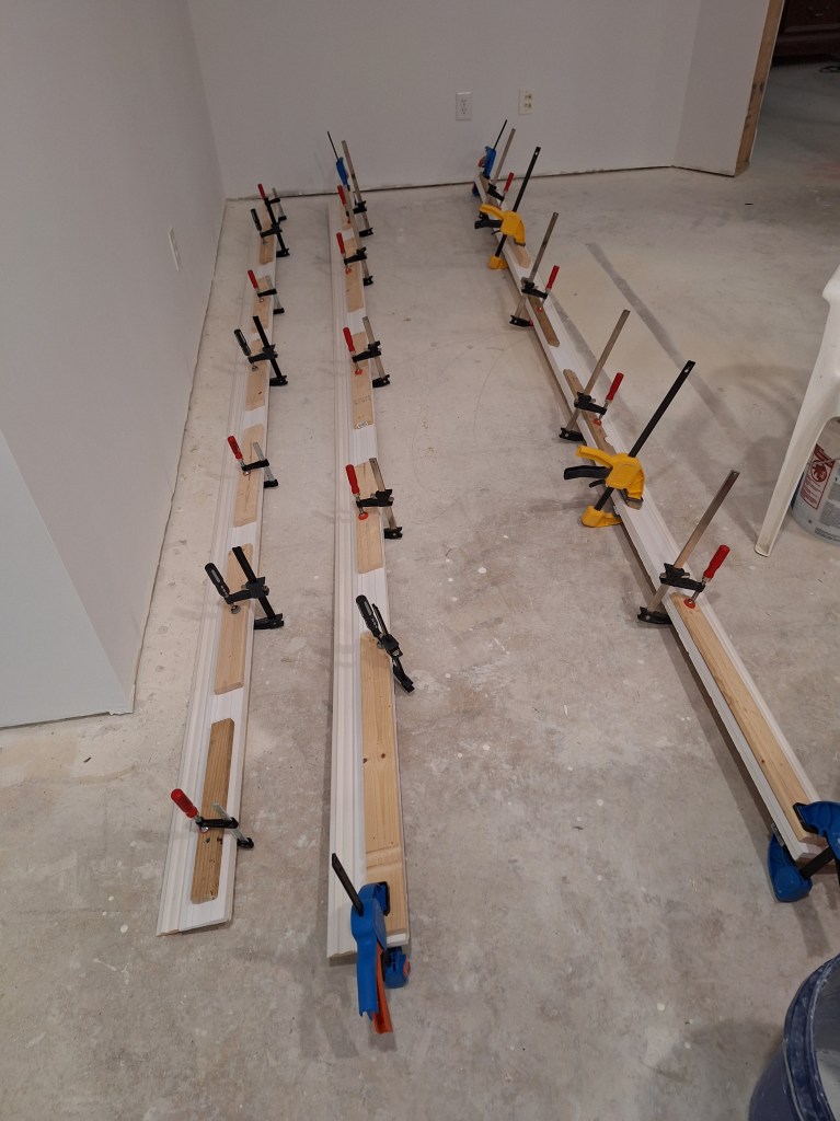 When loading long boards, like the 12′ long baseboards, some additional support is needed so the baseboards don’t flop around during transit. To achieve this, I created an additional board, approximately 12′ in length, again using laminated furring strips. The glue-up is shown below.