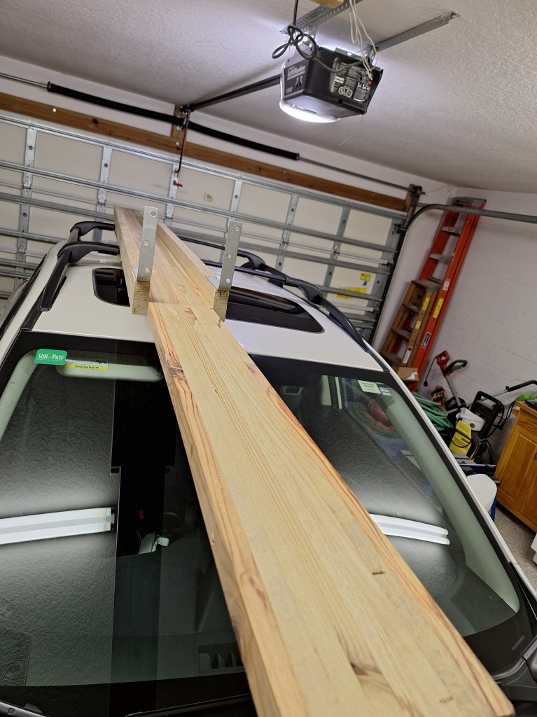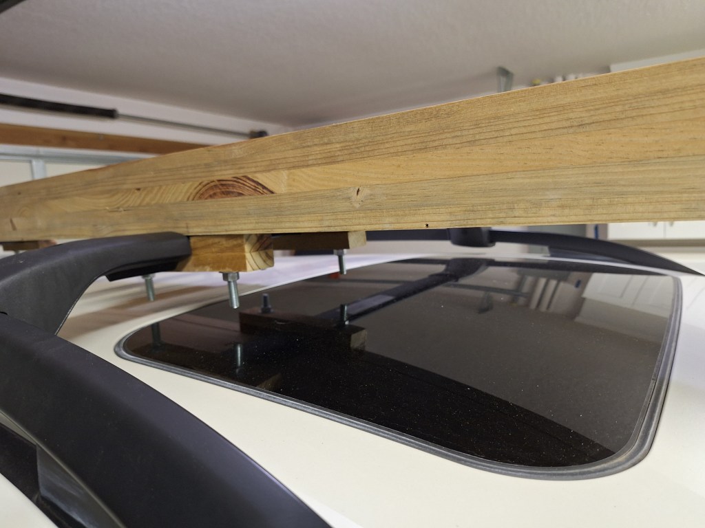 To support sheet goods, I made two rails that would run the length of the car roof and secure to the crossbars. In the image below, you can see one of the rails and the laminated pieces that it’s made of. You can also see the mounting brackets I made to secure it to the front and rear crossbars. BTW, I’ve since replaced the bolts for shorter ones, so they don’t protrude down so far.