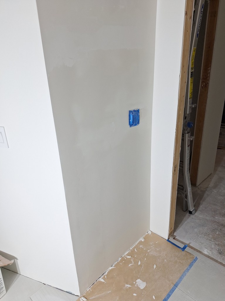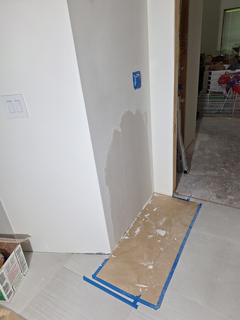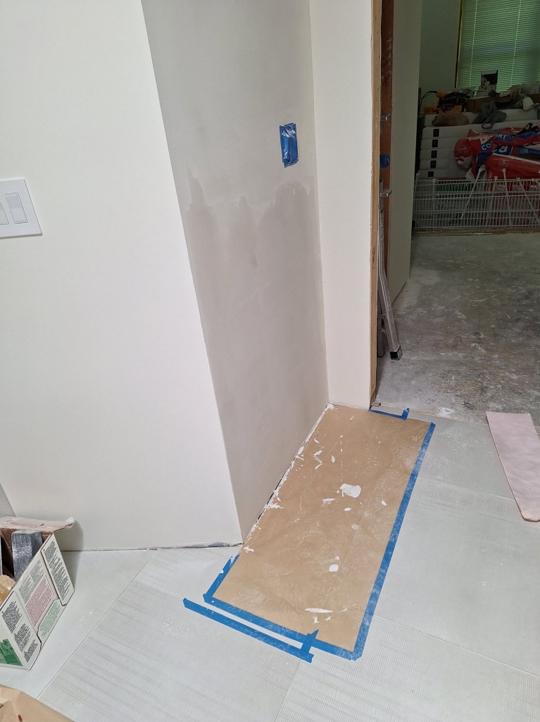 While installing the baseboards, I learned the value of having flat walls and floors. Since my baseboards were made up of two boards glued together, they were particularly stiff. Normally they are somewhat flexible, giving you some wiggle room when it comes to closing gaps between it and the walls, and to some extent that is also true of the floors, although not to the same degree. Since my baseboards were not flexible, any areas where the floor or walls were not flat would be noticeable. One area in particular was the wall to your right when you first enter the master bathroom. When I put down a piece of baseboard to mark it for cutting, I became aware of a significant bow in the wall, which would leave a gap I was not comfortable with. You can get away with small gaps. The caulk will fill them and they will not be very noticeable. But this one was too big for that. So I decided I needed to break out the joint compound and attempt to bring the wall to something much flatter than it was. This was a shame, because that wall was finished. So I got to work building up the area.