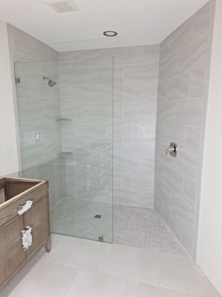 While I was attending to this, the glass installers arrived and put in the glass enclosure to the shower. Here it is: