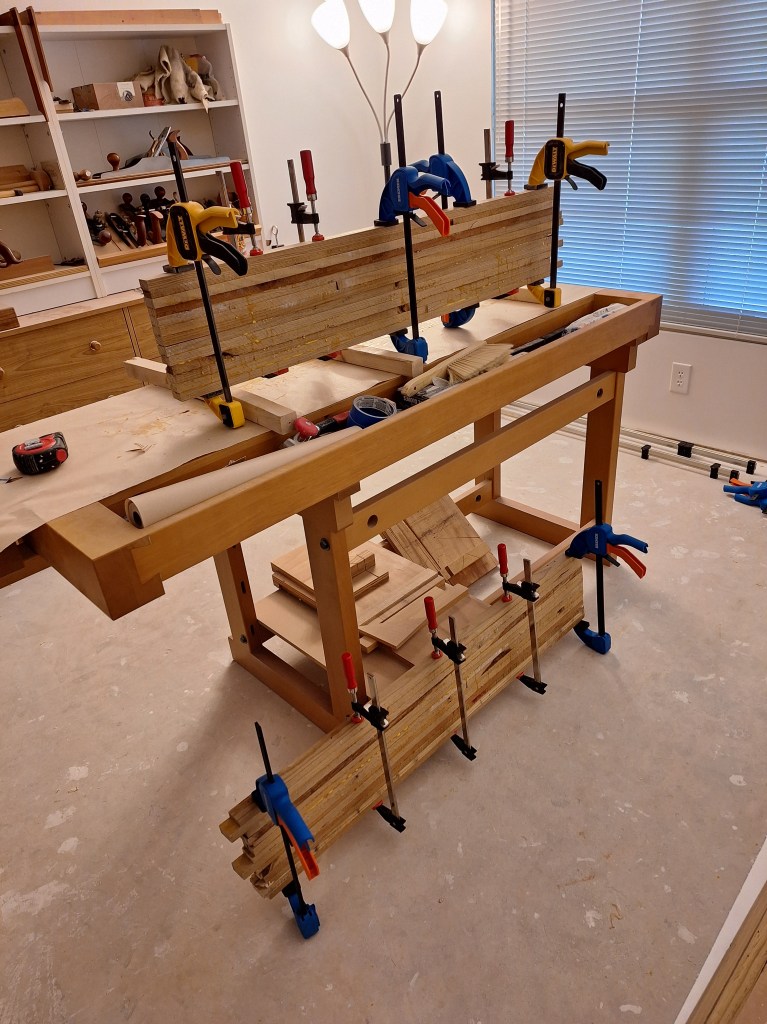 The final thickness would be established once I did the same for the the other two sections. Once they were taken to the same state as what you see above, I would run all three through the thickness planer, one at a time, to ensure they were of the same thickness before gluing the three sections together. Here are the other sections in clamps, ready to set up overnight.
