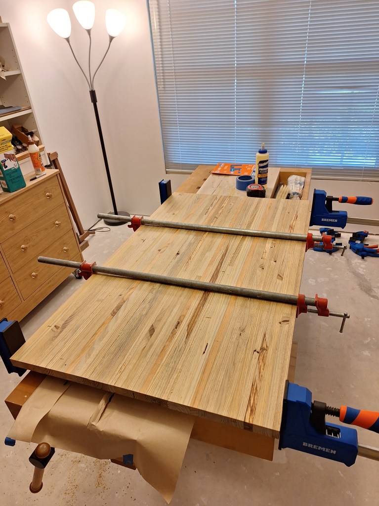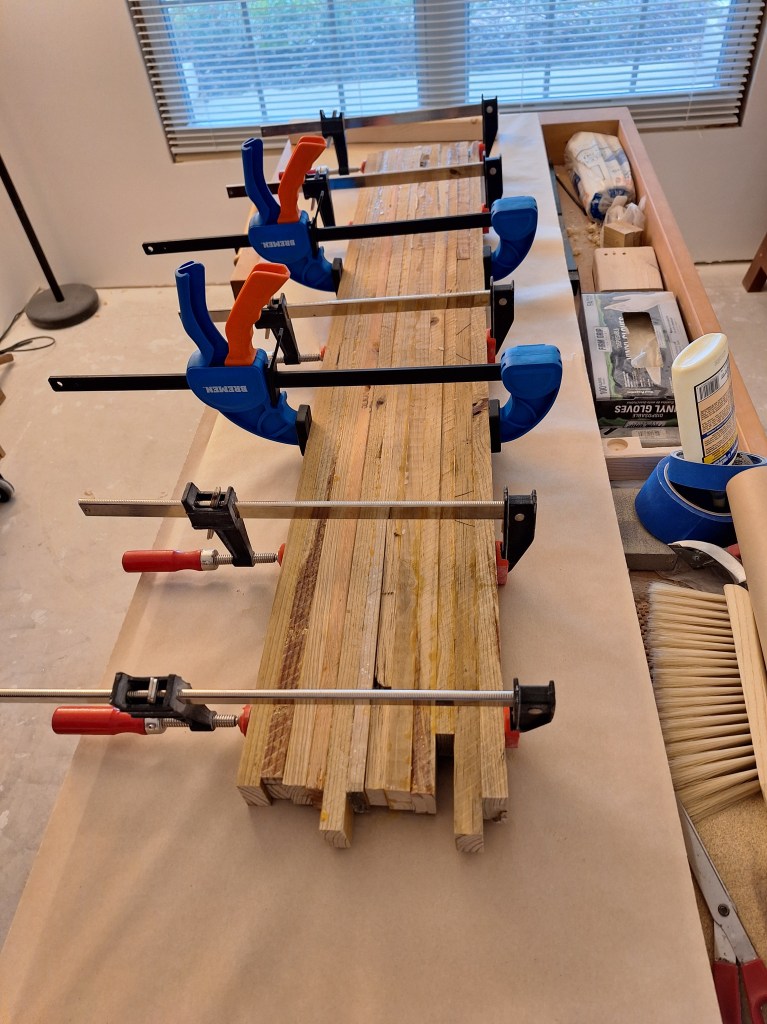 I left the glue to set overnight. The next day I pulled off the clamps and ran it through the thickness planer to get it close to final dimensions, then squared off the ends.