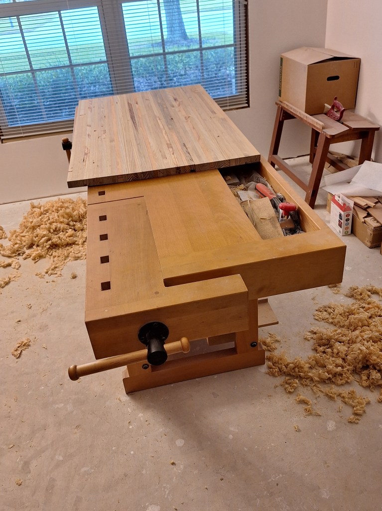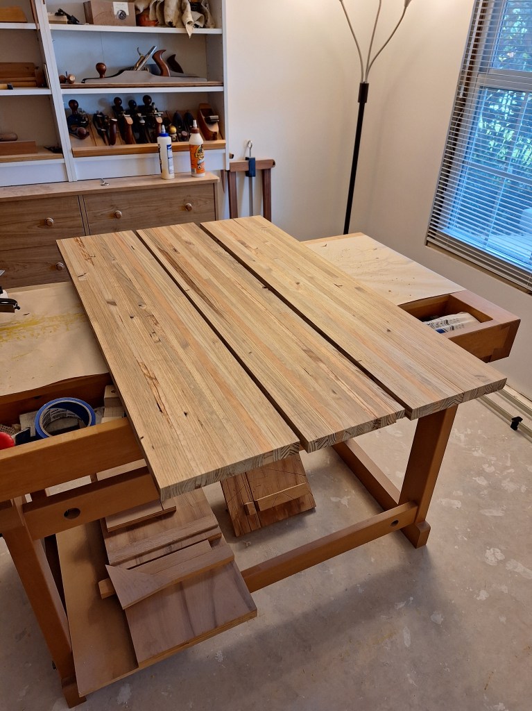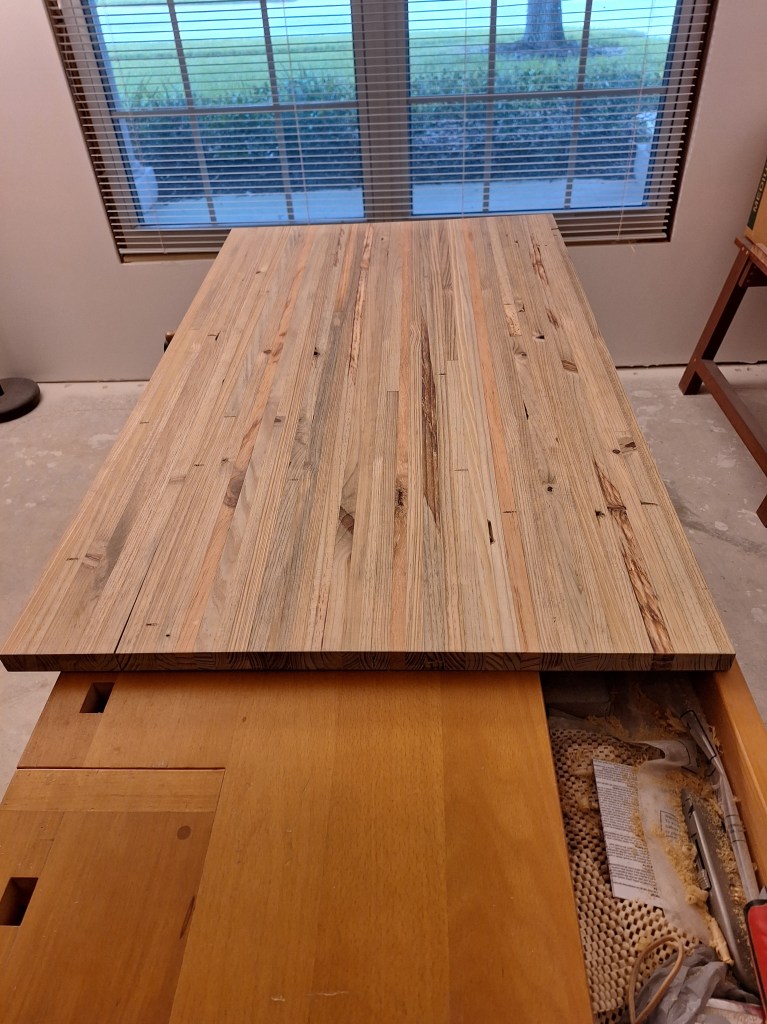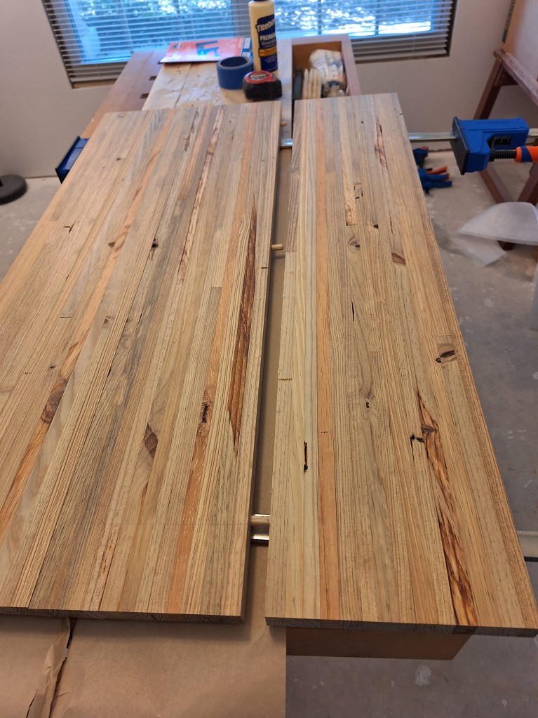 The top needed to be less than 45″ wide to fit in the space I had, and I wanted a depth of around 26″. The dimensions weren’t that important, so I kept those numbers in mind, hoping I had enough material to get close. Maximum yield was what was really driving the dimensions, as long as I didn’t go over the 45″ width. As you can see from pieces on the left in the image above, I didn’t have enough full length pieces to make the depth I wanted, so I had to introduce six rows of two-piece strips to get to about 31″, knowing that I would plane a good bit off in preparation for glue-up, which would hopefully leave me with around the 26″ I was looking for.