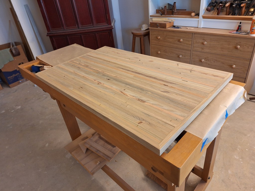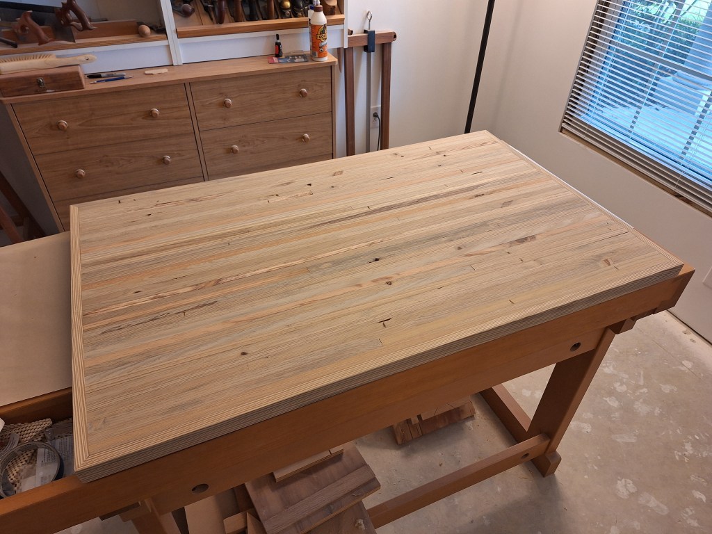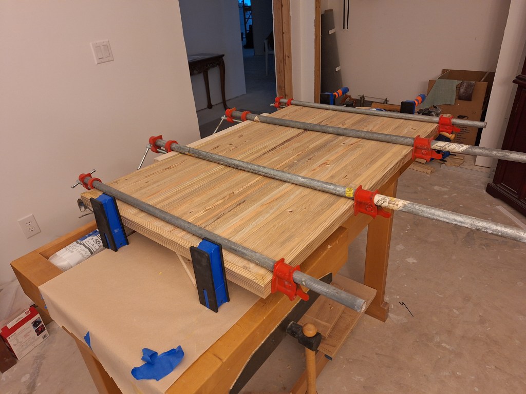 The next day I removed the clamps and scraped off the glue that squeezed out from between the seems. I also place a straight edge across the top to see how flat it was. As you can see from the image below, there was significant cupping. This was largely due to my forgetting to place clamps at the seems. A stupid mistake that resulted in far more hand planing (see below) than should have been needed.