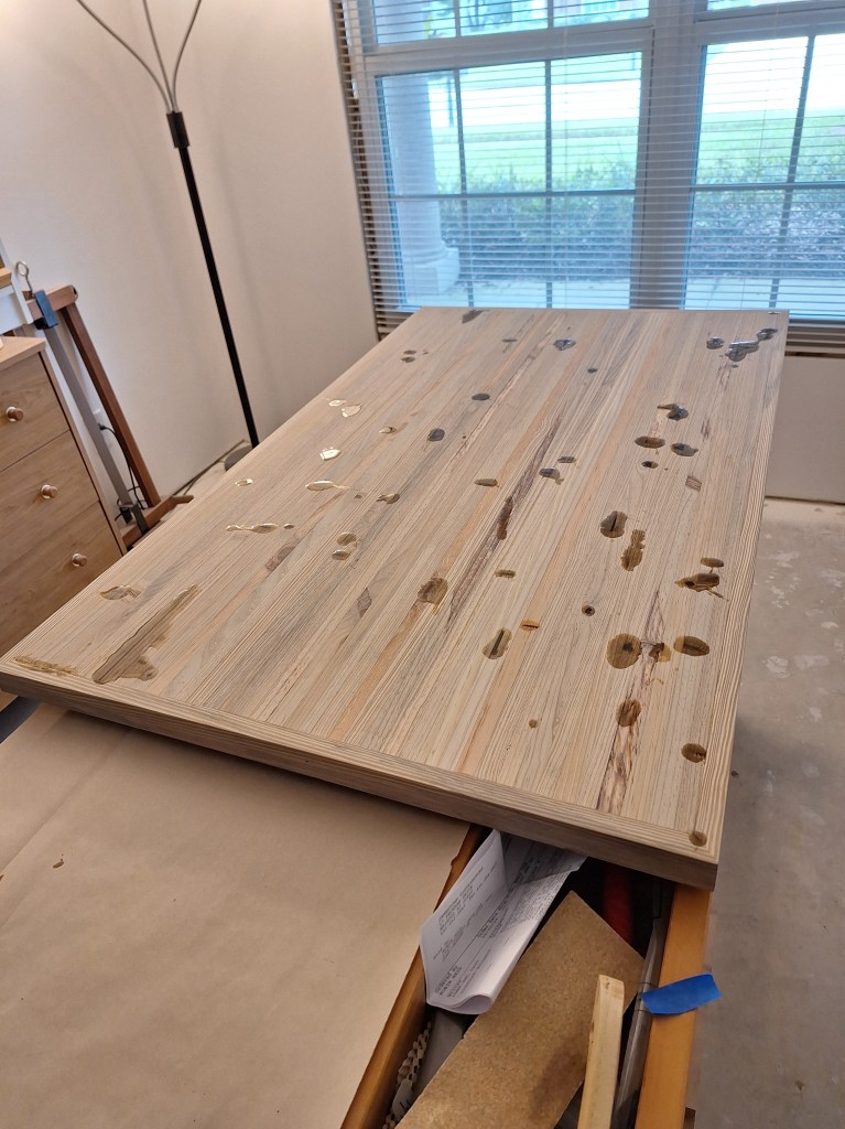 The epoxy comes clear, but I added bronze mica powder and a bit of black to tint it. I’m happy with the color. The next day I planed then sanded it, then added a second application to a few areas that needed it. Once that was cured, I planed it off and sanded it all in preparation for finishing. Here are a couple of shots of it ready for finish.