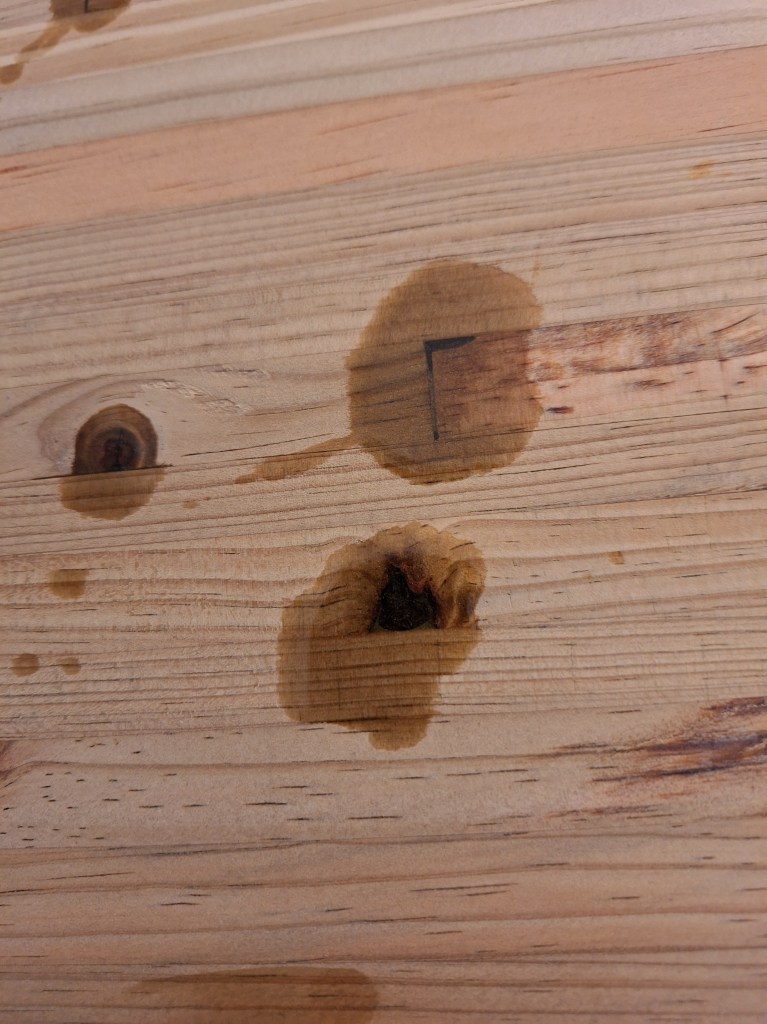 At this stage it looks like I’ve spilled coffee all over it. But that is just part of the process. The bits that overflowed the areas I intended to fill will be planed and sanded away after the epoxy has cured. Here is a closeup of an area.