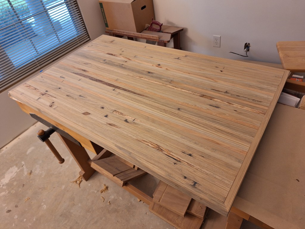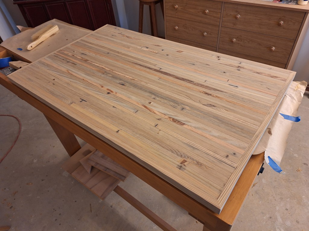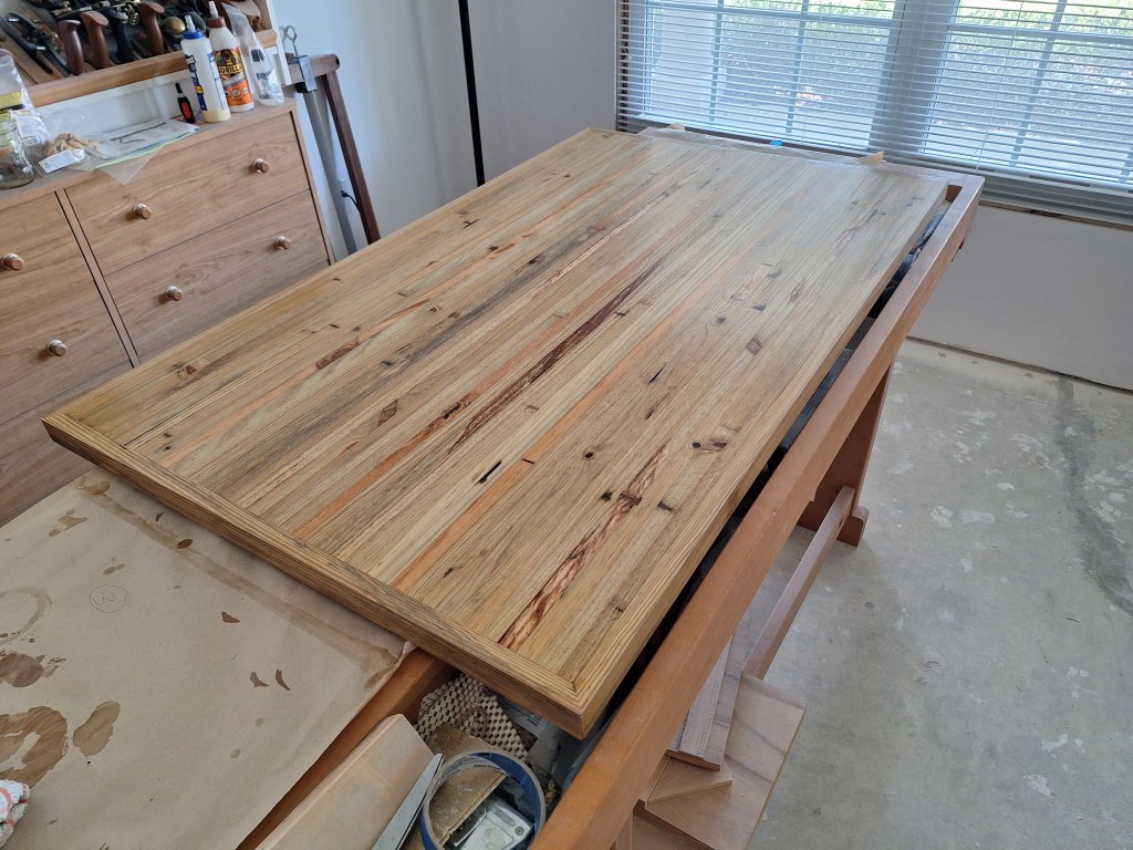 Although it looks pretty good here, I still had a couple of things I wanted to do to it before applying a finish. In order to have no end grain showing I would put an edge around it with mitered corners. I would also use an epoxy resin to fill in any holes. These boards were pretty rough at the start of this, so there were plenty of nail holes, screw holes, and imperfect edges. After the milling process and the hand planing, some of these things were cleaned up, but others were exposed. Using an epoxy resin with a color tint would get it to the state I wanted. But first, I added a solid wood edge around it with mitered corners.